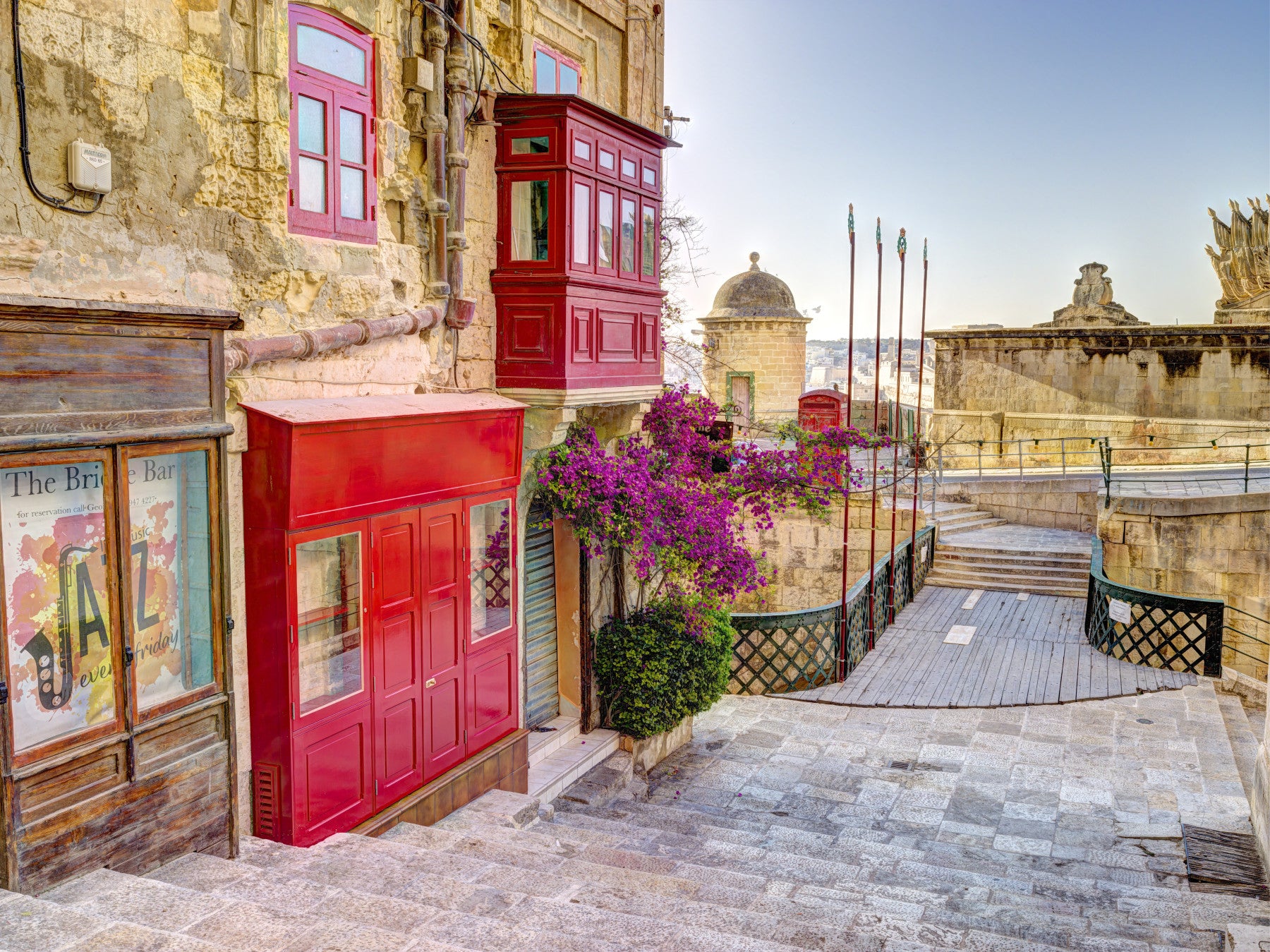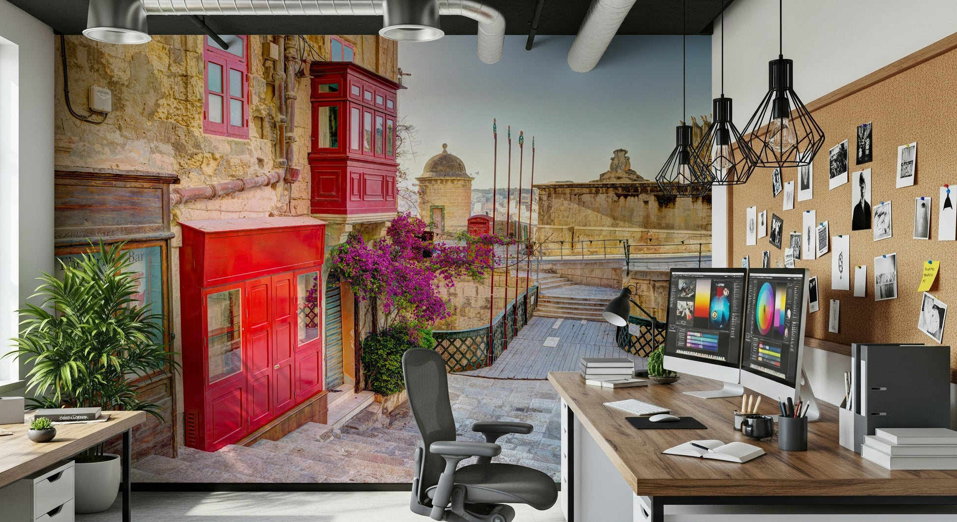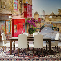 Traditional Maltese buildings in Vallette, Malta. Step into the sun-soaked streets of Valletta with this captivating wallpaper for walls. The design features the historic stone architecture, vibrant red accents, and lush purple bougainvillea, transporting you to the heart of Malta. The warm tones and architectural details evoke a sense of timeless elegance and cultural richness. It perfectly complements living rooms, dining rooms, or hallways, adding character and sophistication to your interiors. Let this scene inspire you to explore the world and add a touch of Mediterranean flair to your living spaces.