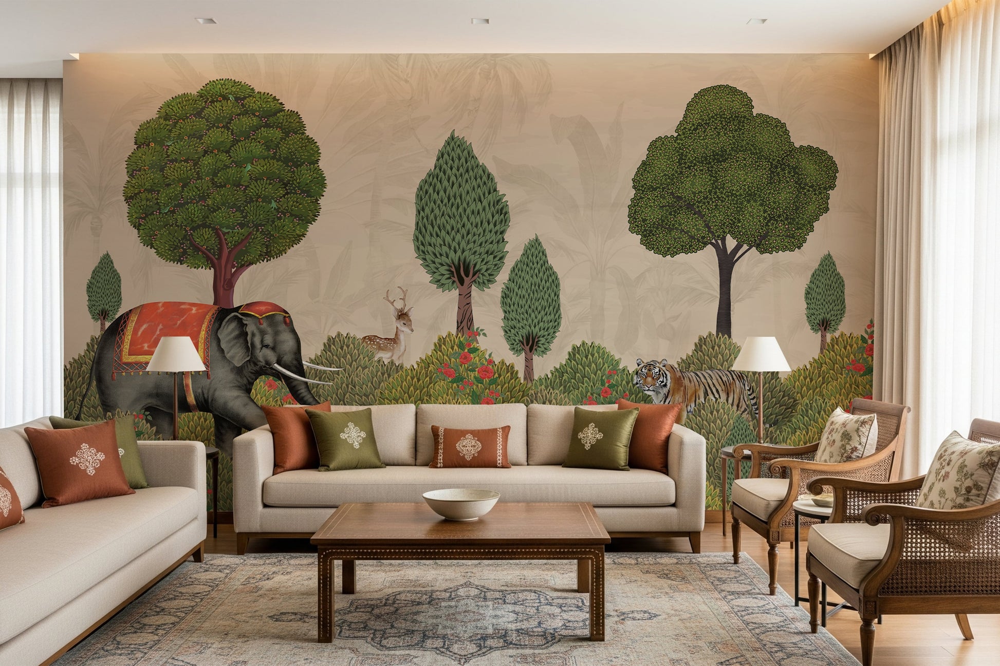 Discover the Van Vaibhav mural, a magnificent celebration of the Splendor of the Forest. This exquisite wallpaper captures the essence of traditional Indian artistry, transforming your space into an enchanted woodland. A royally adorned elephant journeys through a lush landscape, sharing a serene moment with a majestic tiger, a graceful peacock, and a gentle deer. Set against a backdrop of rich foliage and blooming flowers, this design evokes a sense of harmony and timeless elegance. The Van Vaibhav mural is more than just a wall covering; it is a piece of narrative art that brings nature's grand and tranquil story into your home.