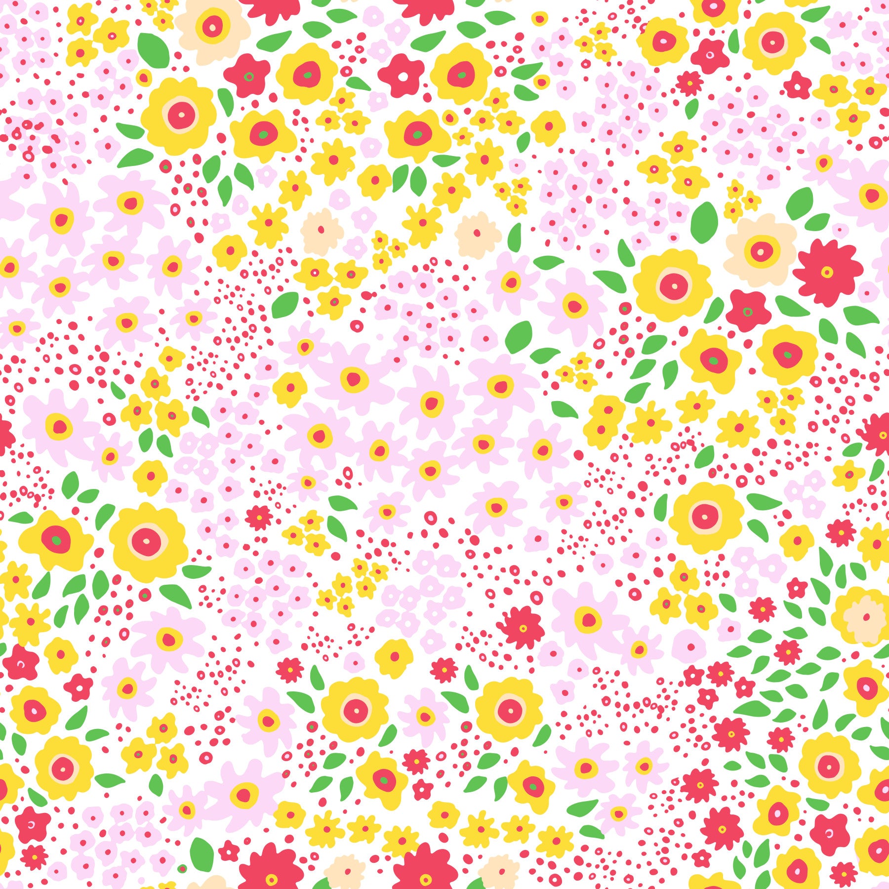 Transform any space with this delightful ditsy floral pattern. A medley of yellow daisies, pink petals, and red blossoms scattered across a white backdrop. Its simple yet cheerful design provides a lively, engaging atmosphere. This wallpaper for walls can enliven kids rooms, bedrooms, and hallways. Introduce a fresh, playful aesthetic that enhances light and airy spaces. Create a cozy corner by using it as an accent wall.