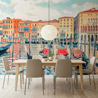 Transform your living space with this scenic wallpaper for walls that transports you to the romantic canals of Venice. The design captures the timeless beauty of Venetian architecture and the iconic gondolas. The water reflects the buildings, creating a soft, inviting ambiance. The buildings glow with warm tones, complementing the cool blue water. This wallpaper blends seamlessly with dining rooms, bedrooms, or hallways, offering a sophisticated touch to any space. It inspires dreams of travel and serene moments.