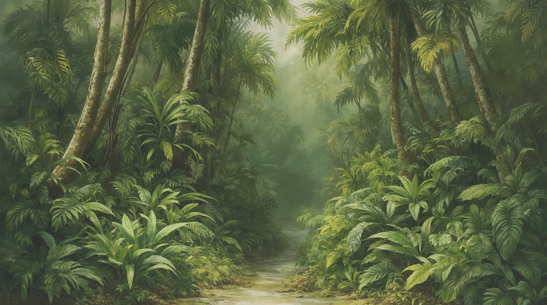 A wide wall mural showing a deep, verdant forest.