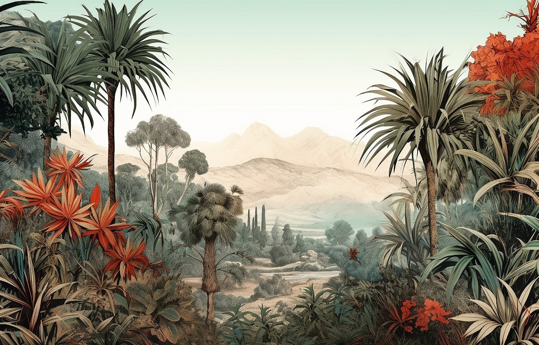 Vintage tropical wallpaper with lush flora and serene valley