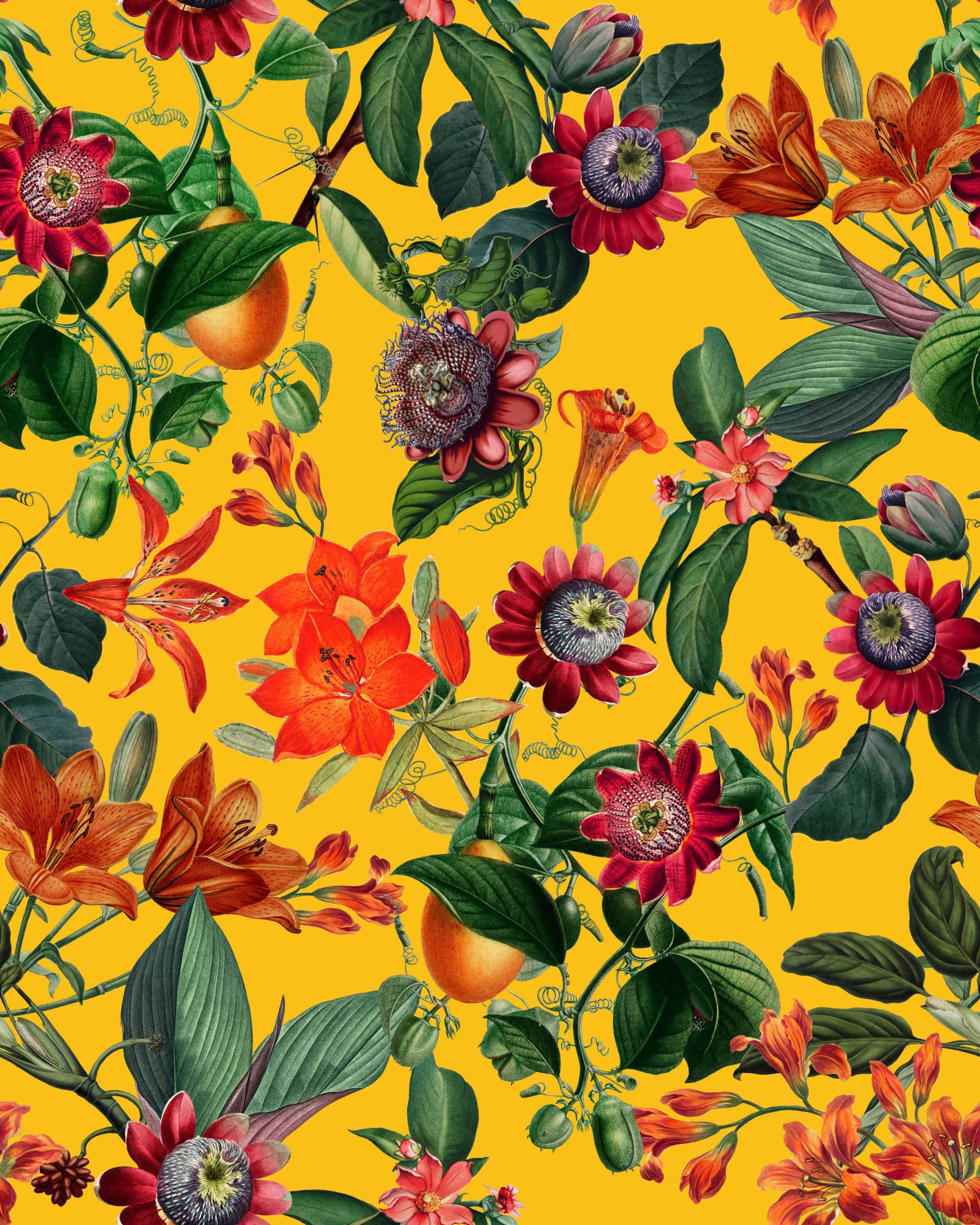 Immerse yourself in a vibrant tapestry of exotic blooms and lush foliage with this wallpaper. Intricate botanical illustrations, reminiscent of vintage prints, burst forth in rich reds, oranges, and deep greens against a sunny yellow backdrop. Passionflowers, lilies, and other exotic flora intertwine in a harmonious yet lively composition, creating an atmosphere of tropical exuberance and timeless elegance. This design is perfect for adding a touch of sophisticated nature to any room, making it a captivating and energizing focal point.