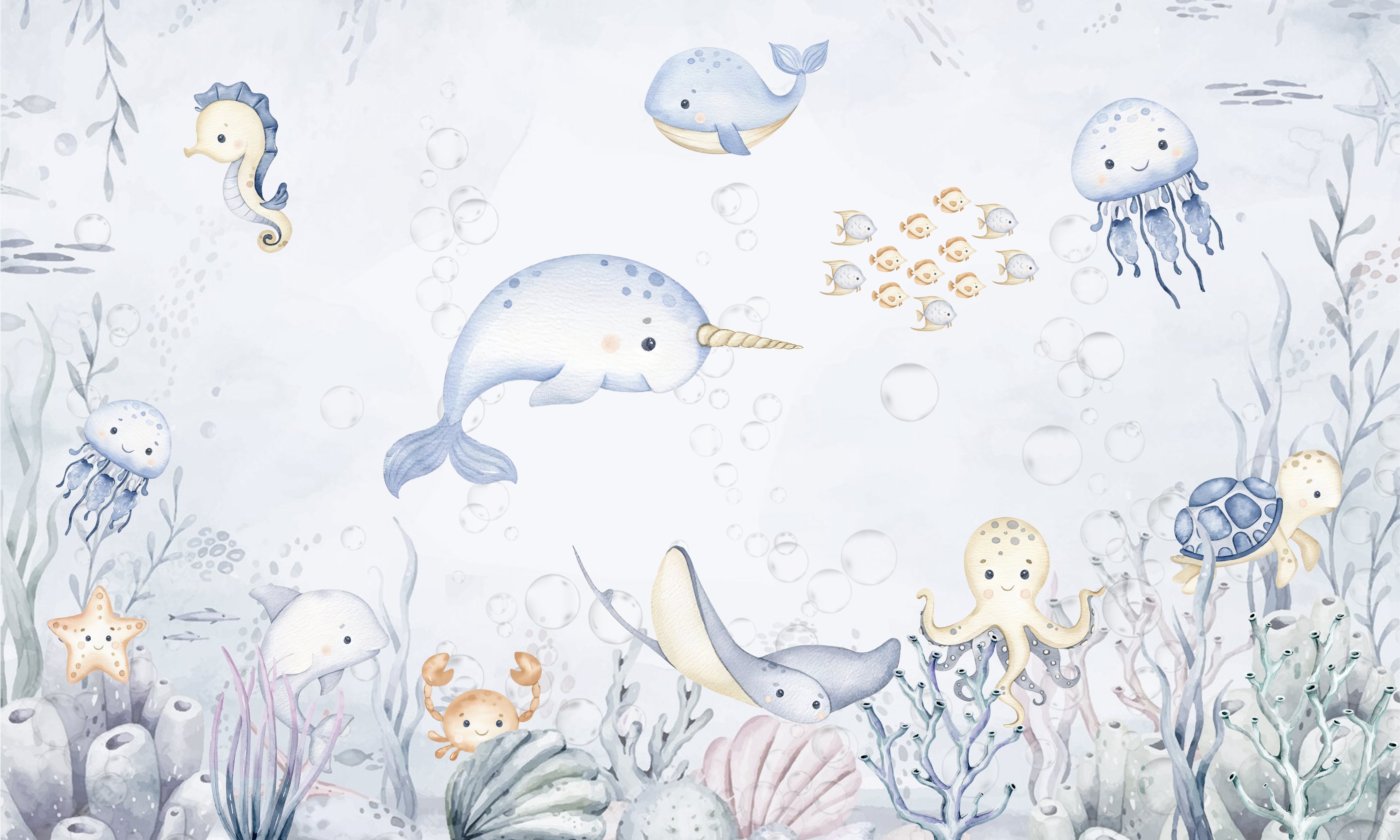 Plunge into a whimsical underwater journey with this vibrant underwater fish wall mural, a magical touch for a kids room wallpaper. Watch your childs eyes light up with joy as their room comes alive with the colors of the sea, where playful whales and grinning octopuses swim alongside fleets of vibrant fish. This mural invites a stream of stories and adventures, making it more than just a wallpaper, but a gateway to an ocean of dreams. Each brushstroke captures the essence of a child's boundless imagination, making it the perfect backdrop for playtime tales and restful slumbers under the sea.