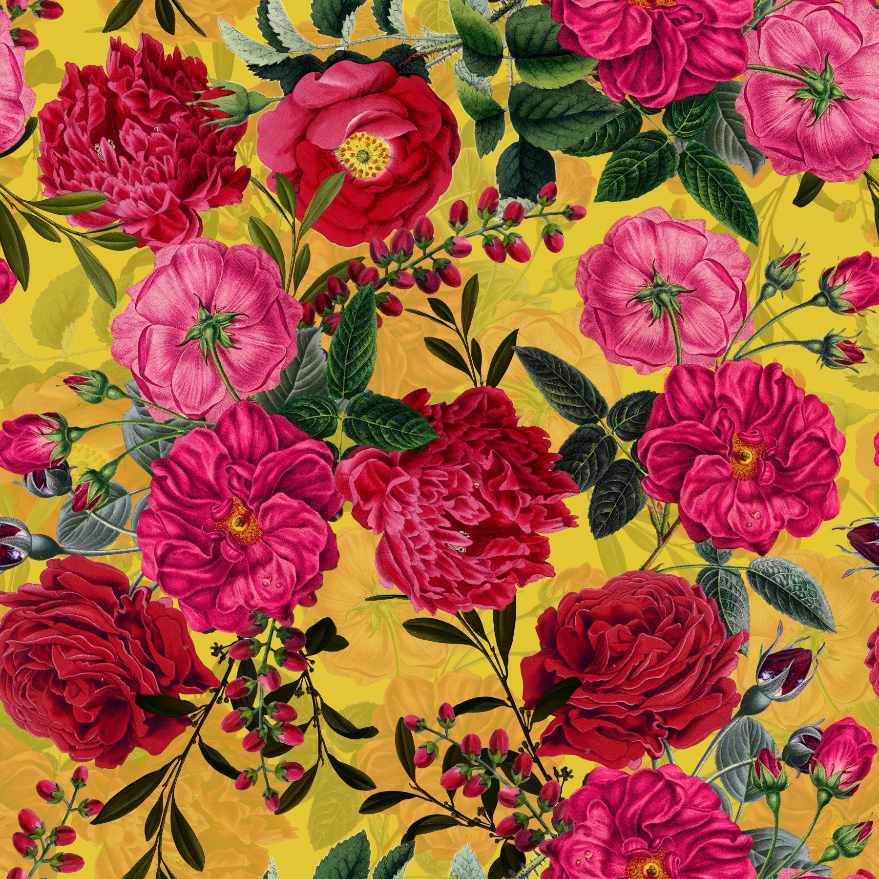 Immerse yourself in the beauty of this vintage-inspired floral wallpaper. A profusion of richly colored roses in deep reds, vibrant pinks, and fuchsia hues bursts forth against a sunny yellow backdrop. The detailed botanical illustrations capture the intricate textures and delicate petals of each bloom, creating a sense of opulence and timeless elegance. Perfect for adding a touch of classic charm to any room, this wallpaper is sure to captivate and inspire.