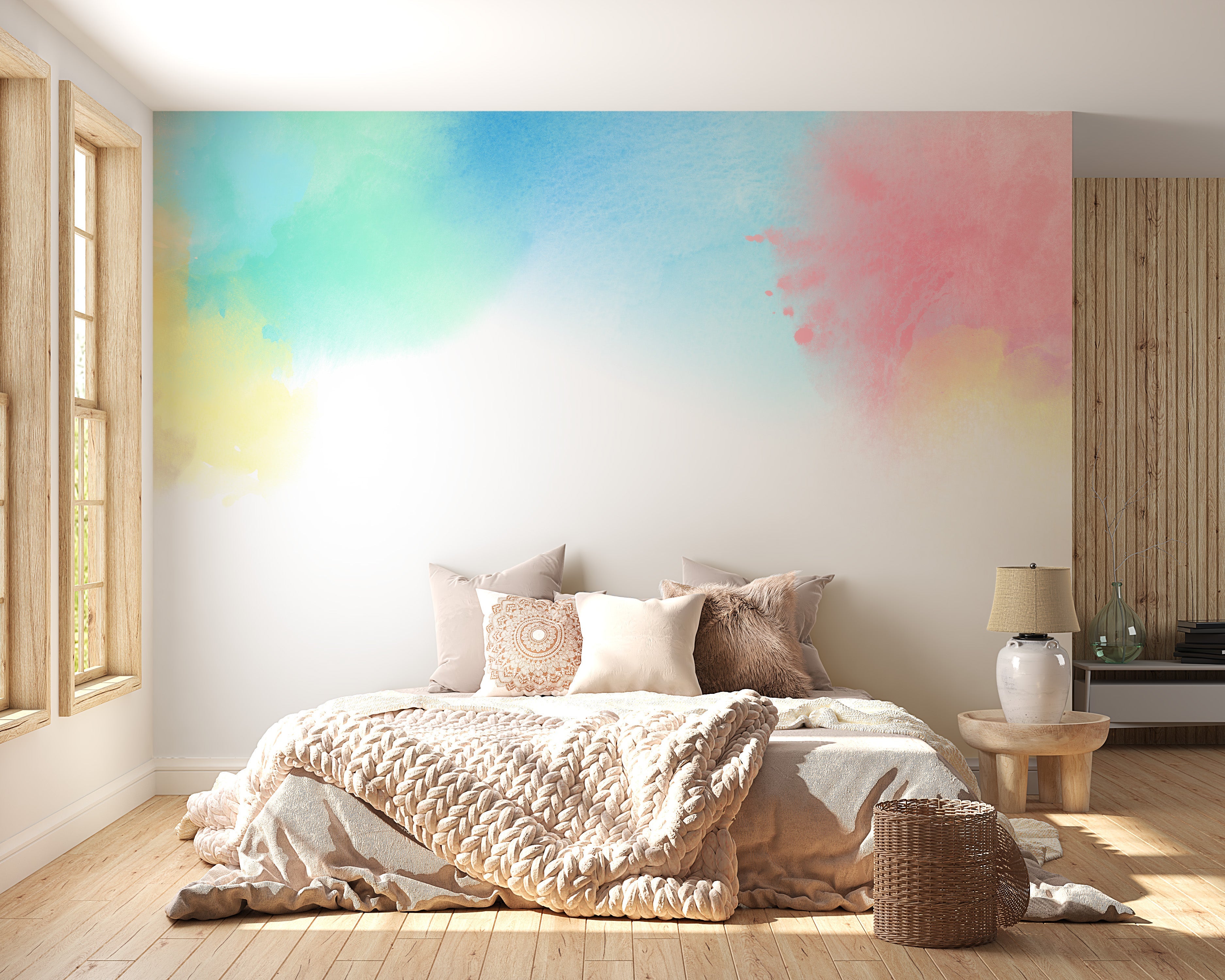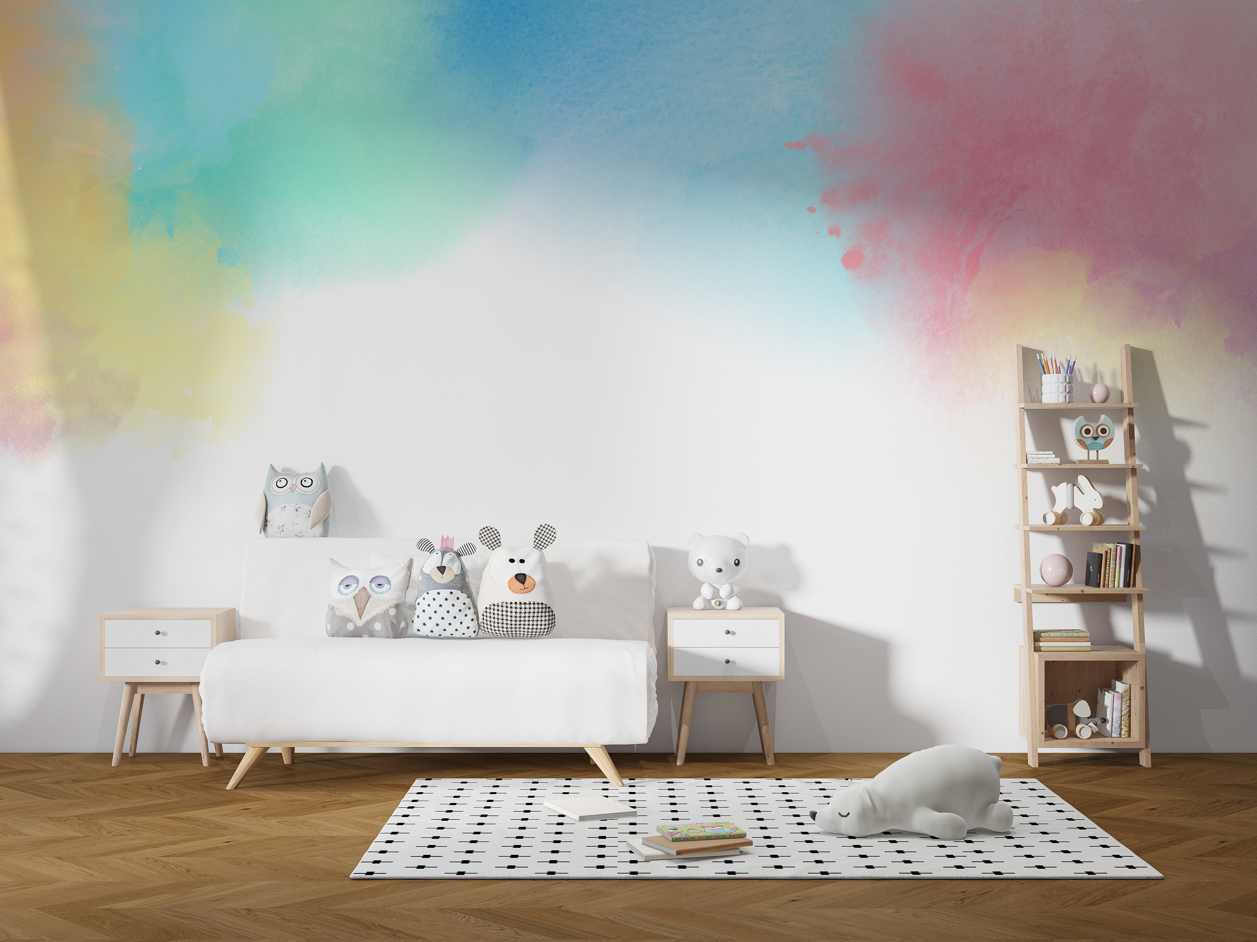 Bright watercolor splash mural wallpaper for kids’ bedroom walls.
