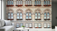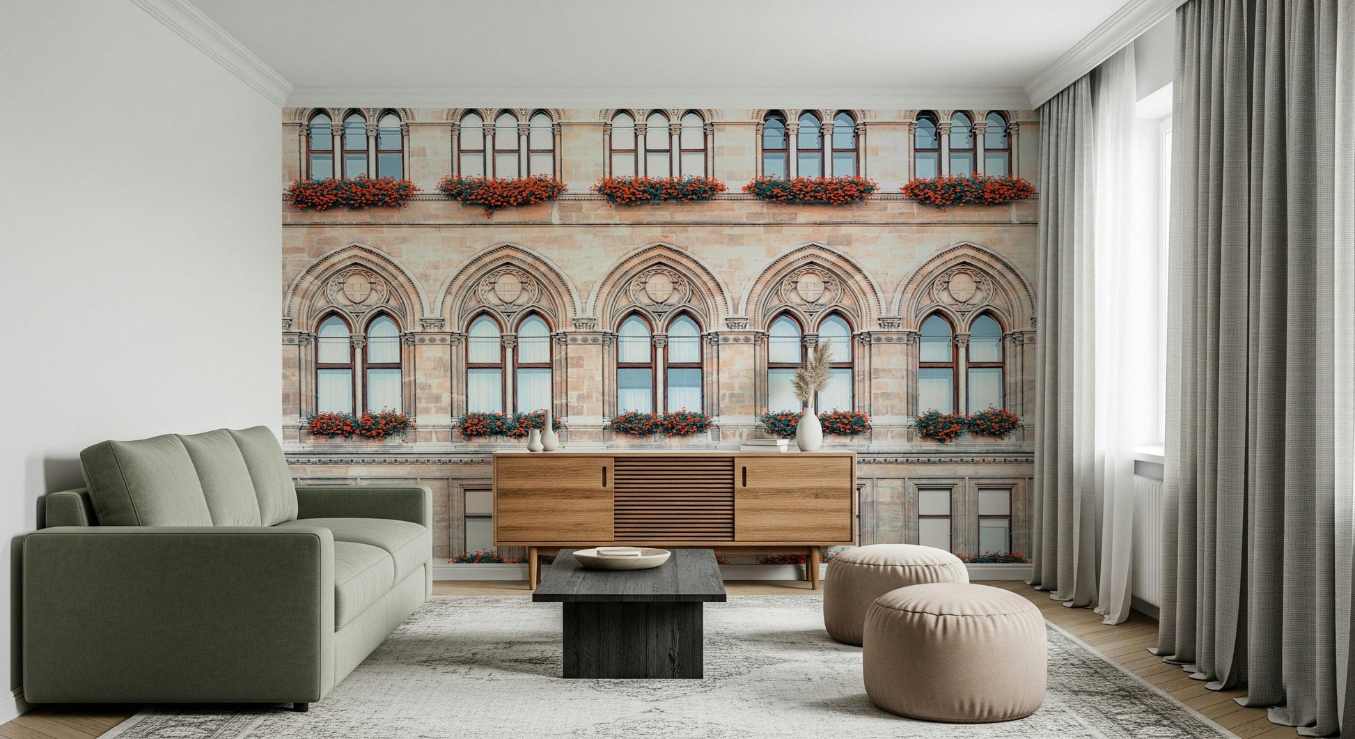 Transform any room with this grand architectural wallpaper for walls. It features a detailed facade with arched windows, framed by stone and adorned with vibrant red flowers. The building's stonework showcases subtle variations in beige and tan, creating depth and dimension. This wallpaper adds a sophisticated, old-world charm to living rooms, dining rooms, or hallways. The repeating pattern creates a striking visual impact, lending a sense of height and formality to your space. This design complements classic, traditional, and even modern minimalist interiors by introducing a captivating focal point. It enlivens interiors without overpowering existing decor.