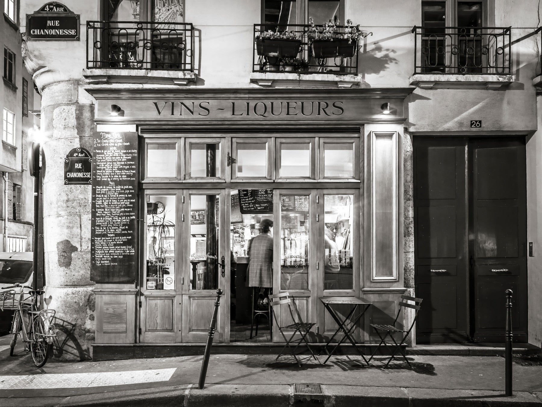 Vins-Liqueurs A Parisian Noir Wallpaper, black and white French café scene.