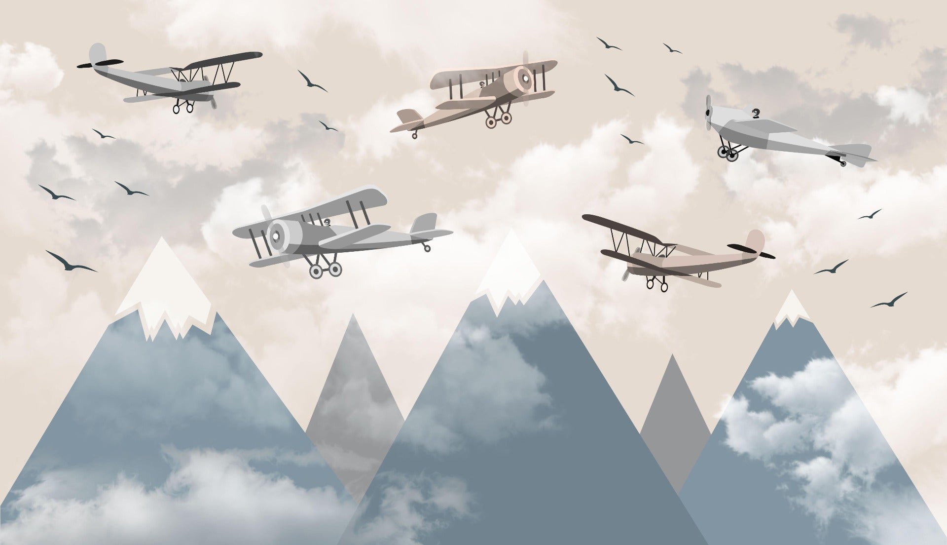 Flying biplanes over mountains vintage wallpaper decor.