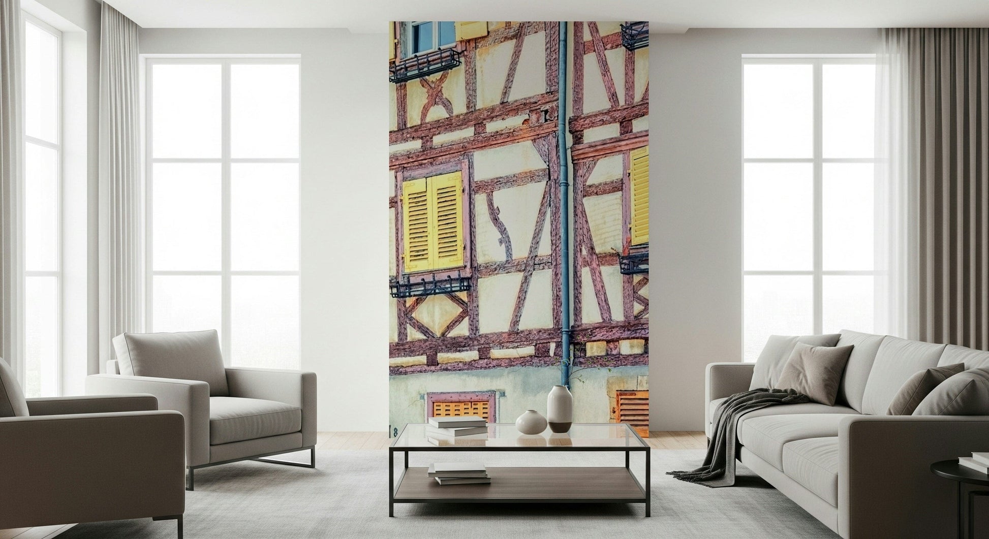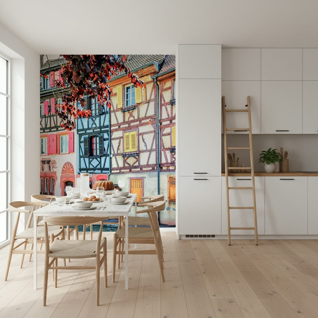 Introduce an enchanting vintage vibe to your interior with this unique wallpaper for walls. The design presents an array of timber-framed houses with shutters painted in cheerful hues of pink, yellow, and blue, capturing the essence of an old European village. Ideal for a cozy bedroom, a welcoming entryway, or a stylish living area, this wallpaper infuses a sense of history and warmth. The vintage style and vibrant colors complement both modern and classic furnishings, creating a visually appealing focal point and enhancing the room's ambiance.