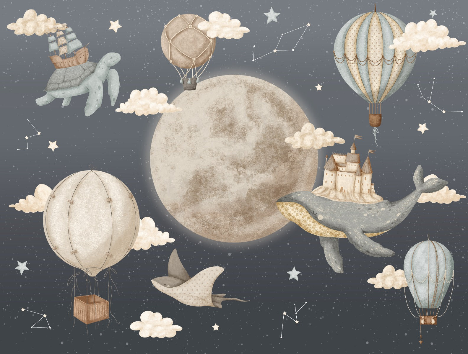 Moon and whale-themed vintage balloon wallpaper