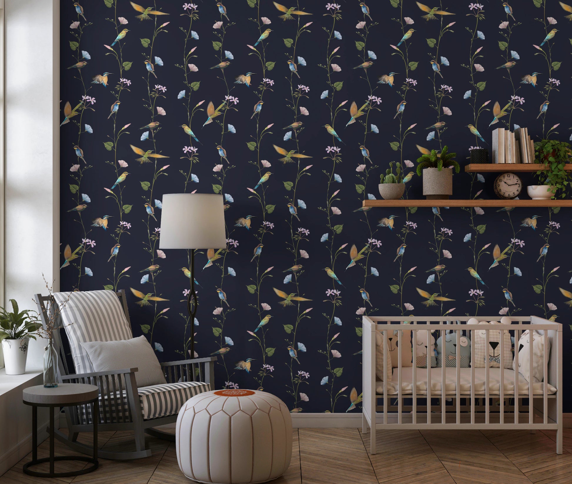 Transform your walls into a serene escape with "Vintage Birds in Moonlit Garden." This enchanting design captures a moment of quiet beauty, depicting delicate songbirds amidst blossoming vines bathed in soft moonlight. Subtle hues of blue, pink, and gold dance across the surface, creating an ethereal ambiance that is both calming and captivating. The artwork evokes a sense of nostalgia and timeless elegance, infusing any room with charm and sophistication. Let this exquisite composition bring the allure of a moonlit garden into your home, offering a tranquil sanctuary within your living space.