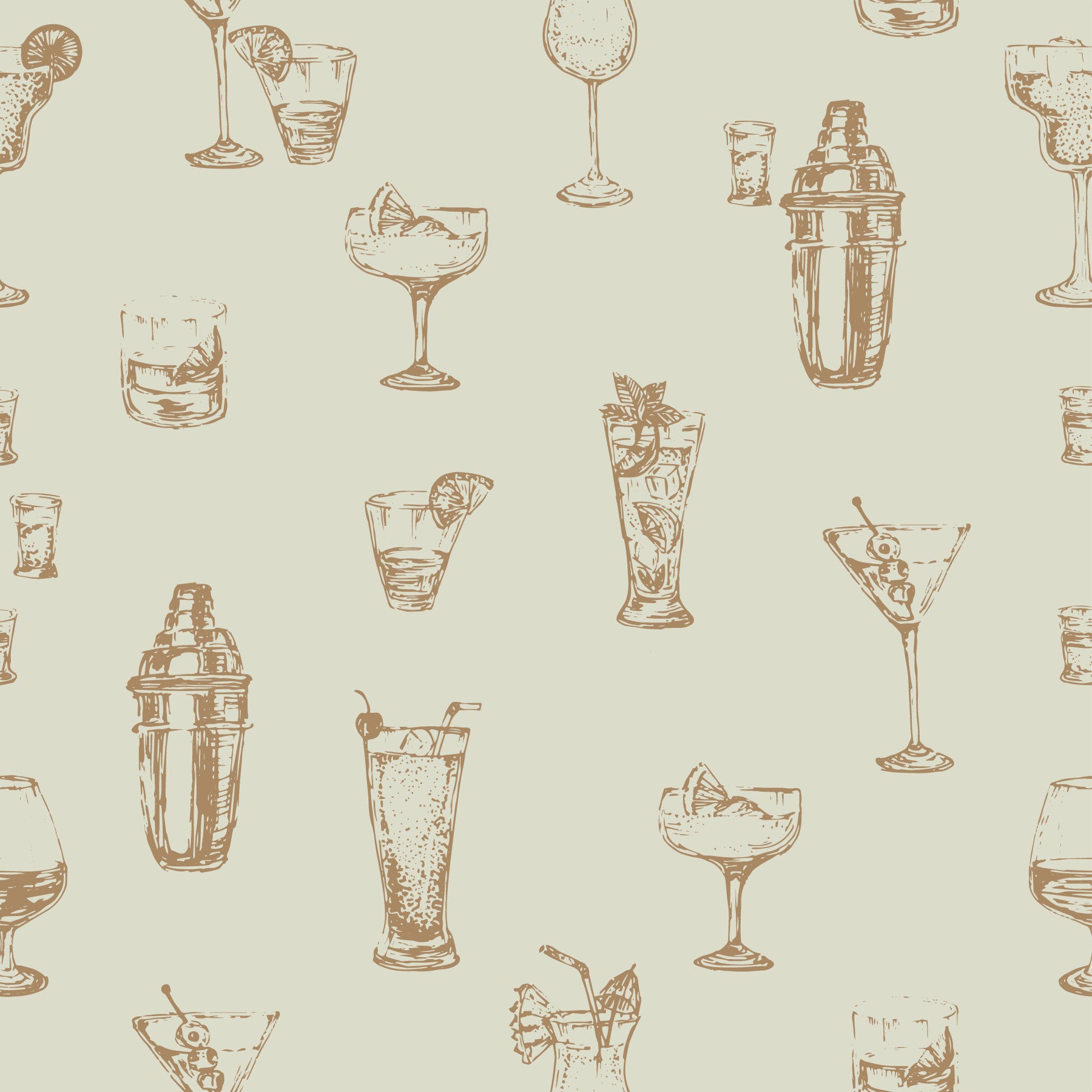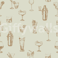 Indulge in a sophisticated atmosphere with this vintage cocktail wallpaper. The hand-drawn illustrations of classic cocktails and bar tools create a charming and stylish pattern. Subtle taupe-colored sketches against a pale sage green background evoke a sense of nostalgia and relaxed elegance, perfect for a bar, lounge, or home with a retro vibe. The seamless design ensures a cohesive and visually appealing look in any space, adding a touch of old-world charm to your interior décor. Perfect for adding a touch of class to your home or business.