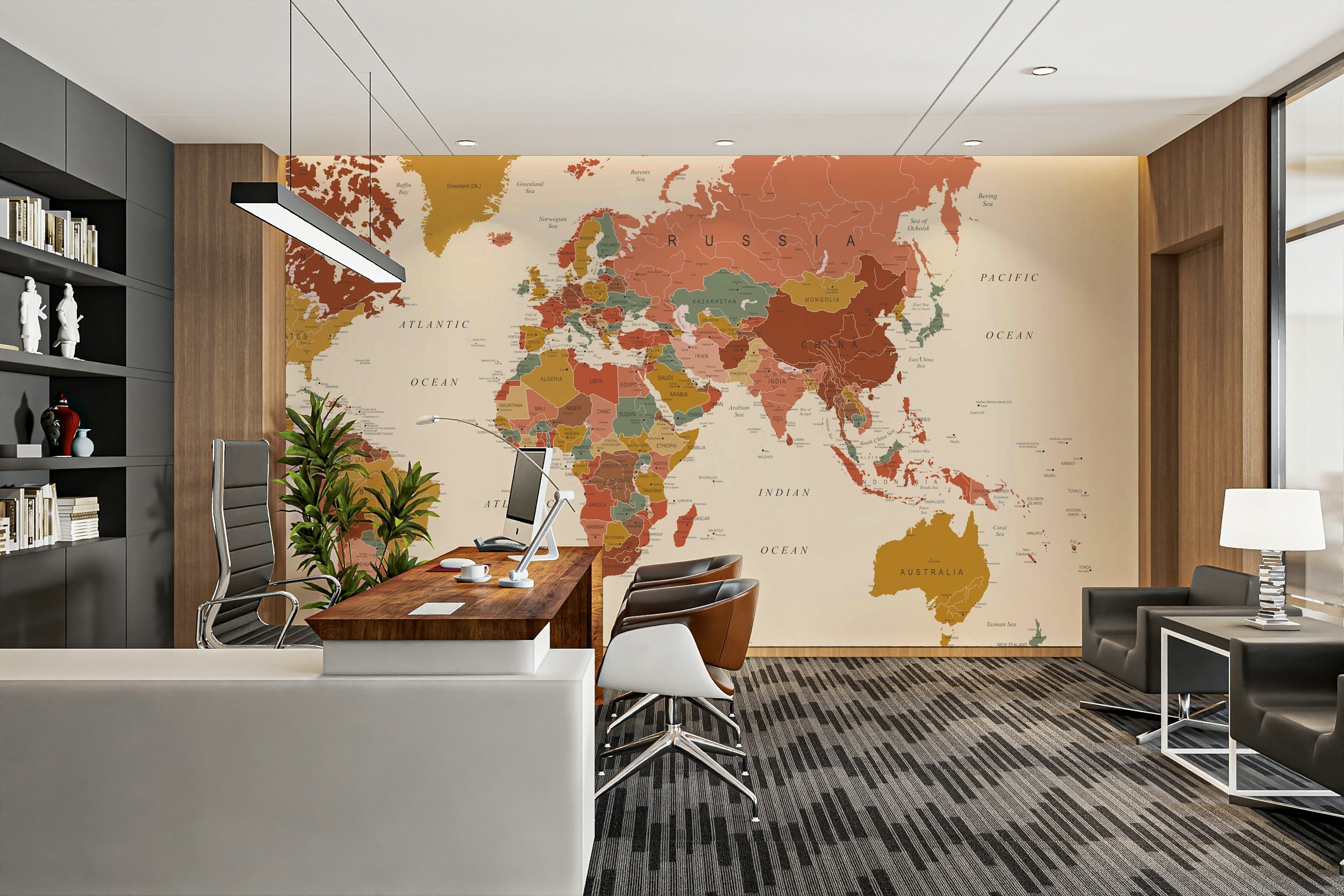 The Vintage Earth Tone Map Global Style Wall Mural gives your space a grounded look with classic world map details in muted browns, greens, and ochres. This mural wallpaper works well as wallpaper for walls in offices, study rooms, or living areas. The vintage tones and clear country outlines make it both decorative and informative. As a wall mural, it adds structure and interest without being loud. It pairs nicely with wood furniture, neutral colors, and natural textures. Ideal for those who enjoy timeless design and a quiet sense of world perspective in their interiors.