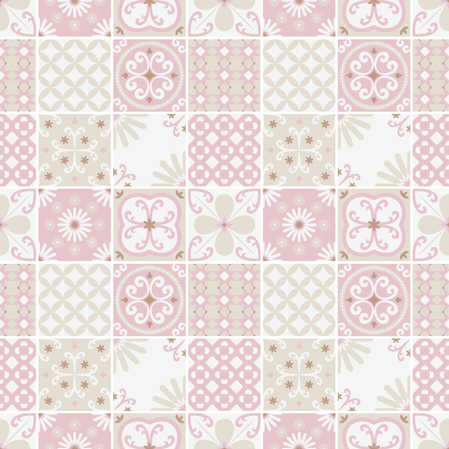 Detail of the quatrefoil and floral tile motifs in the pink wallpaper mural.