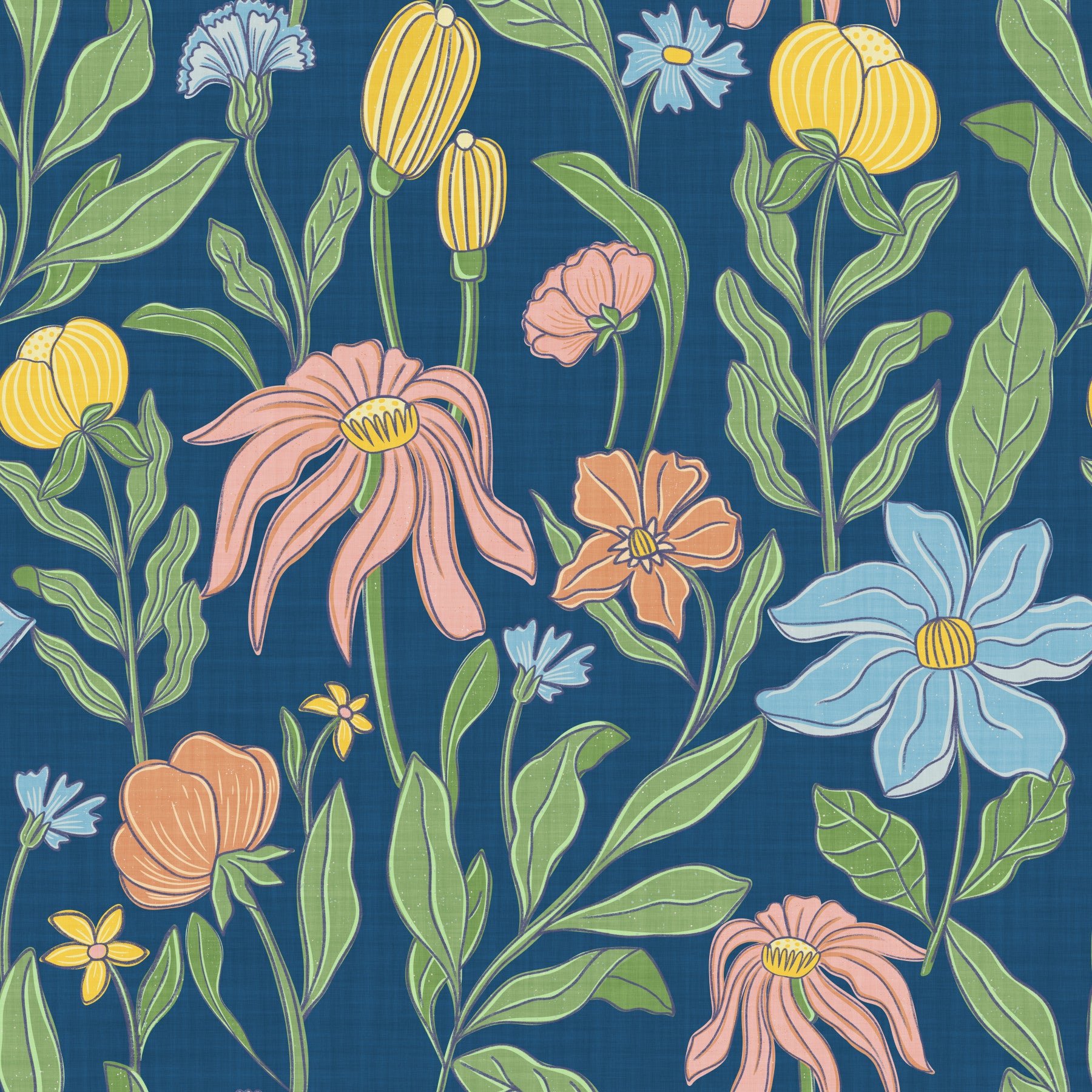 Introduce classic charm with this detailed floral wallpaper. Soft hues of orange, pink, and yellow dance upon a deep blue canvas. The design lends a sense of calm and nature to your home. Perfect for a bedroom, living room, or dining area, this wallpaper for walls blends vintage style with modern sensibilities. Its gentle color palette creates a welcoming retreat that complements classic and contemporary interiors, adding warmth and character.