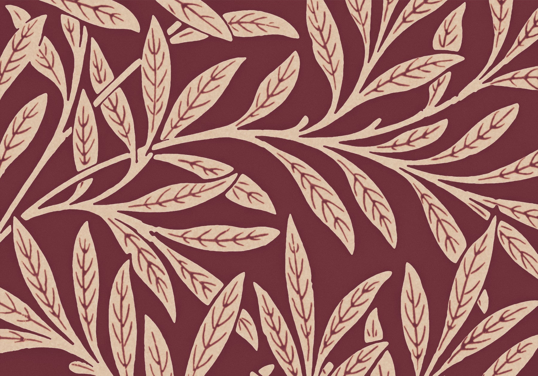 Invite nature indoors with this botanical wallpaper. Light beige leaves create a relaxed pattern on a maroon canvas. Consider this wallpaper for walls in a hallway or dining room to make a bold statement. This charming botanical element provides a delightful backdrop for family dinners. This design harmonizes with classic or contemporary furniture choices, adding elegance and depth to any interior space.