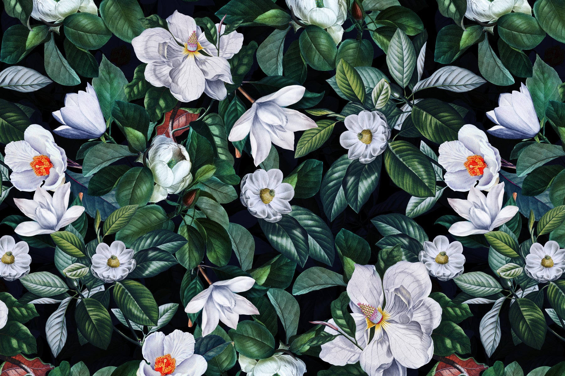 Step into a realm of vintage elegance with our 'Vintage Midnight Magnolia Flower Garden' by Uta Naumann wallpaper. Immerse yourself in the captivating allure of a moonlit garden where ethereal white magnolia blossoms unfurl against a backdrop of deep, verdant foliage. The design evokes a sense of timeless beauty, reminiscent of antique botanical illustrations. Each delicately detailed petal and leaf is rendered with exquisite precision, showcasing the natural grace of magnolias in full bloom. The contrast between the luminous flowers and the dark, mysterious background creates a striking visual depth, adding a touch of drama and sophistication to any space. Perfect for creating a serene and stylish sanctuary, this wallpaper invites you to embrace the quiet beauty of a vintage-inspired floral haven. Transform your walls into a canvas of enduring charm with this enchanting magnolia masterpiece.