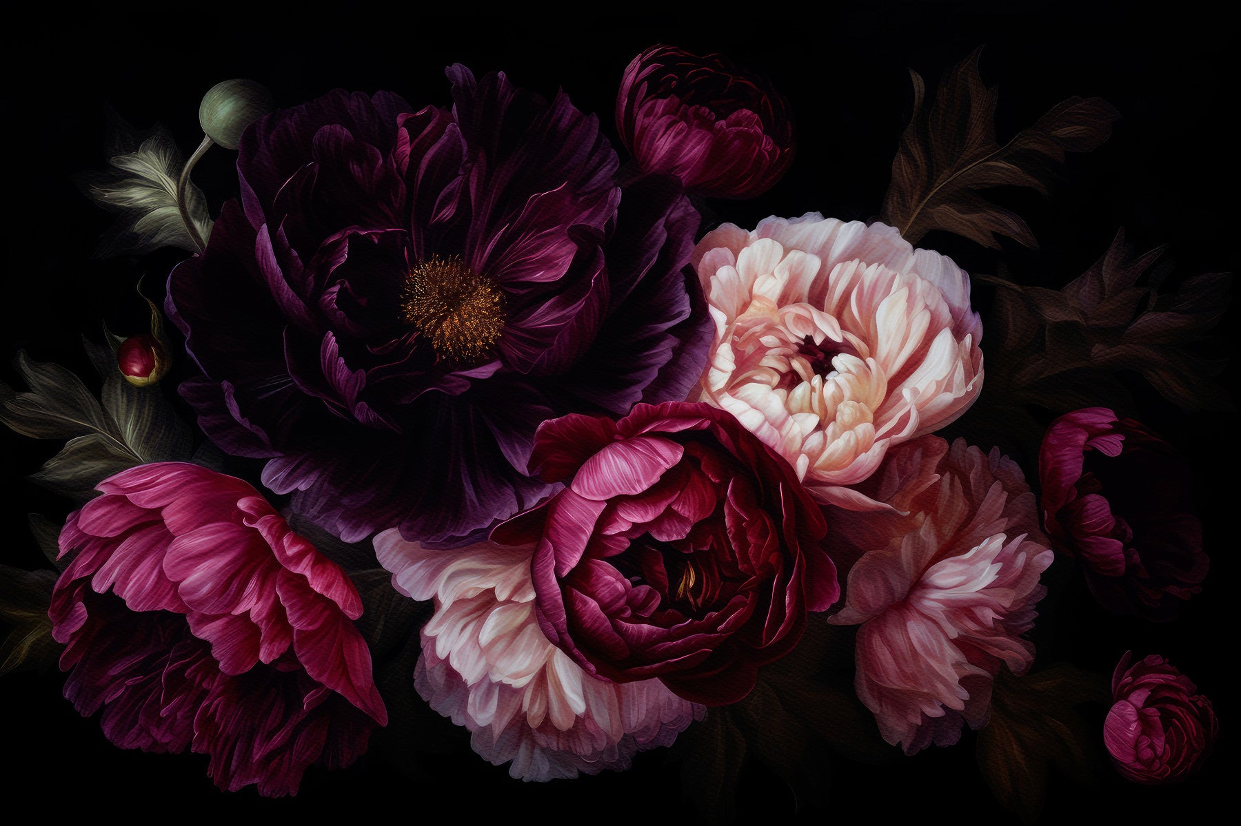 Indulge in the opulent beauty of "Vintage Midnight Peonies Flower Garden." This wallpaper showcases a breathtaking bouquet of richly hued peonies, their velvety petals ranging from deep burgundies and dark purples to soft, blush pinks. Bathed in a dramatic midnight setting, the flowers exude a vintage charm, enhanced by the meticulous detail and painterly style. The contrast between the dark background and the vibrant blooms creates a captivating and sophisticated atmosphere, perfect for adding a touch of elegant mystery to your digital space. Each petal is rendered with exquisite precision, highlighting the luxurious texture and the alluring depth of these stunning blossoms. This wallpaper is a celebration of dark romanticism and floral artistry.