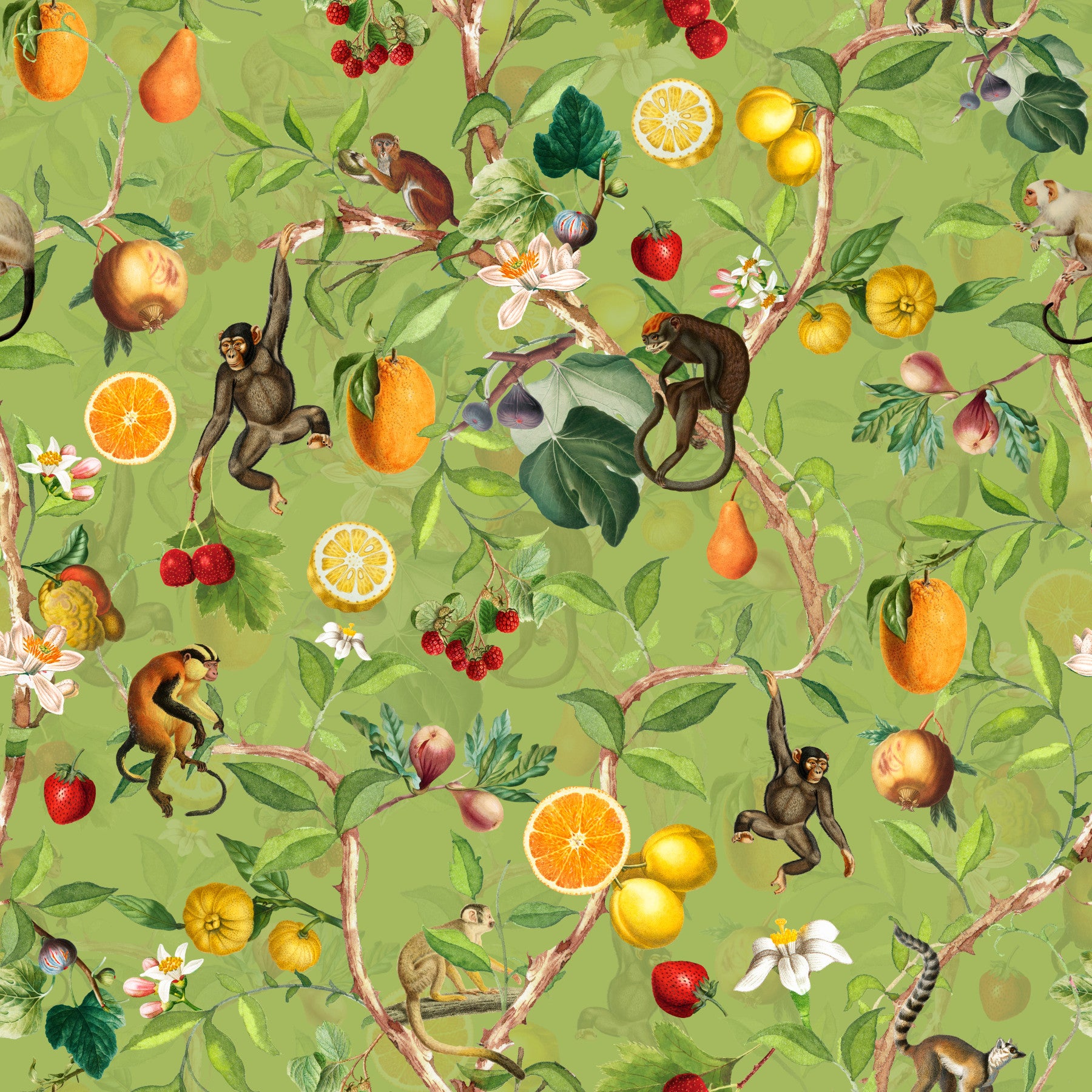 This wallpaper transports you to a whimsical, vintage world where playful monkeys swing among lush branches laden with vibrant fruits. A seamless pattern of oranges, lemons, figs, pears, and strawberries, rendered in exquisite detail with a watercolor-like style, creates a joyful and lively atmosphere. The muted green background complements the rich colors of the fruits and the detailed illustrations of the primates, resulting in a wallpaper that is both sophisticated and fun. Ideal for adding a touch of playful elegance to any room in your home.