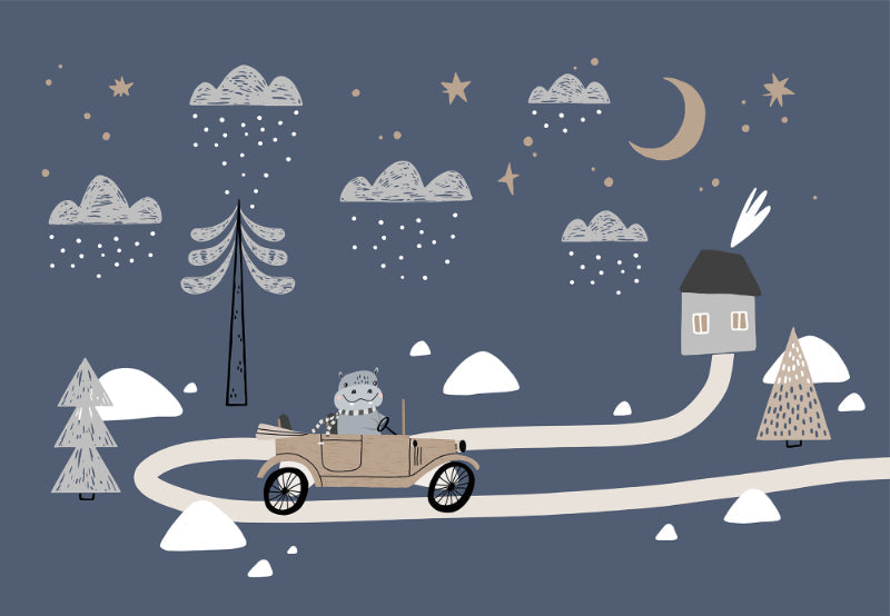 This imaginative paper mural displays an idyllic night landscape in soft colours ideal for a children's bedroom. With a smile, a friendly hippopotamus car drives down an almost serpentine road in a bygone, wood-panelled automobile. Over my head was a deep blue sky filled with light, clouds, soft snow, the sky itself, stars, and the crescent moon. A cosy house with a smoking chimney and multiform trees contribute to the fairy tale feel of the scene. This kid's wallpaper mural produces a calming/playful background without being overstimulated and, thereby, is appropriate for building a peaceful/creative space for children to play and think.