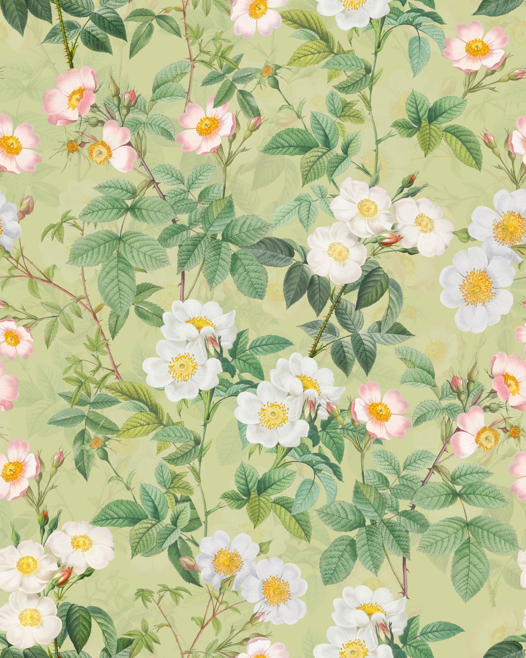 Step into a timeless world of floral elegance with this wallpaper. Inspired by classic botanical illustrations, it showcases a lush array of pale pink and white roses intertwined with verdant leaves against a soft sage green background. The detailed artistry and seamless pattern create a sophisticated and calming atmosphere, perfect for enhancing the beauty of any room. The vintage aesthetic evokes a sense of nostalgia and tranquility, making it ideal for bedrooms, living rooms, or any space seeking a touch of refined charm. This wallpaper is more than just a design; it's a statement of refined taste.