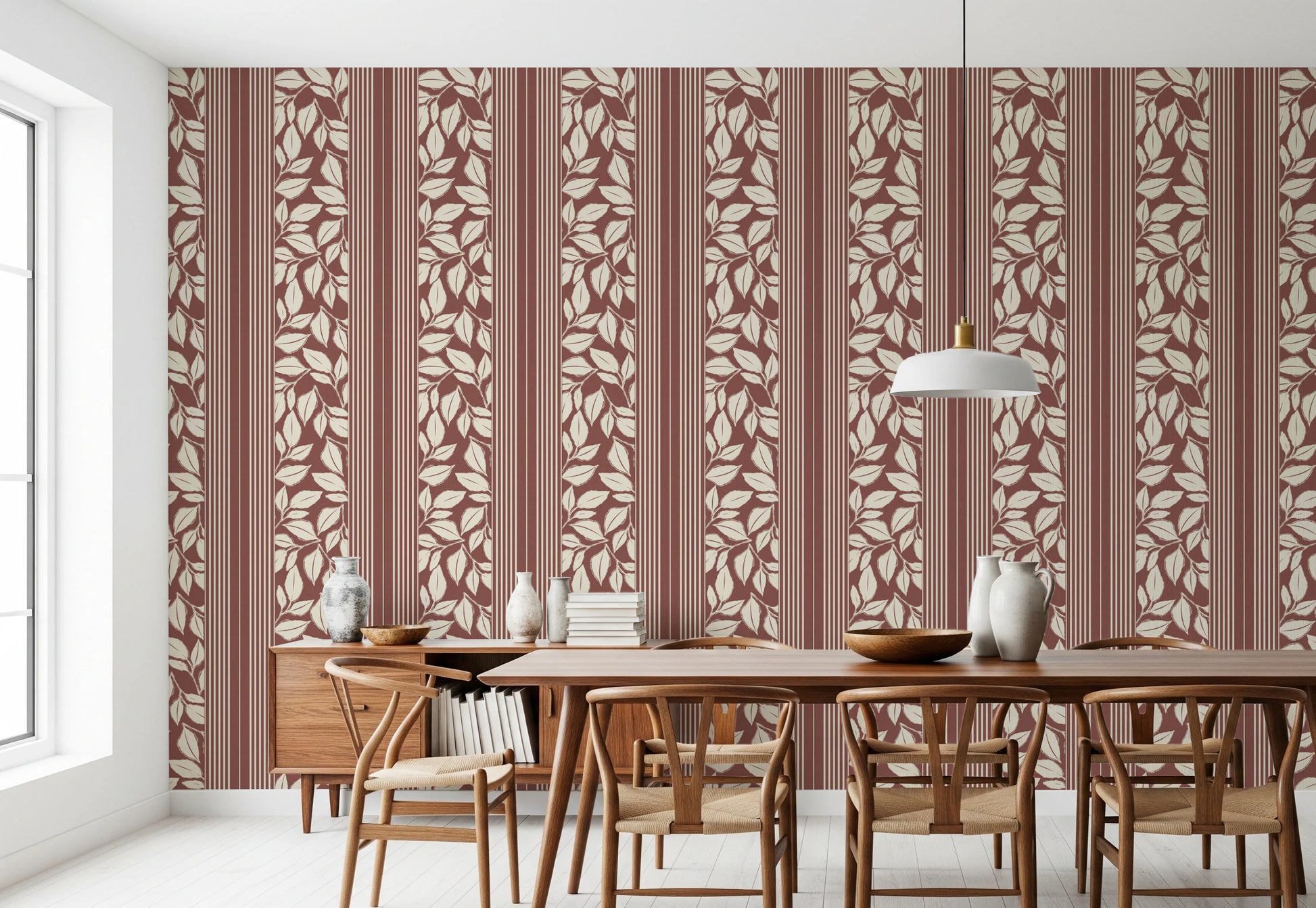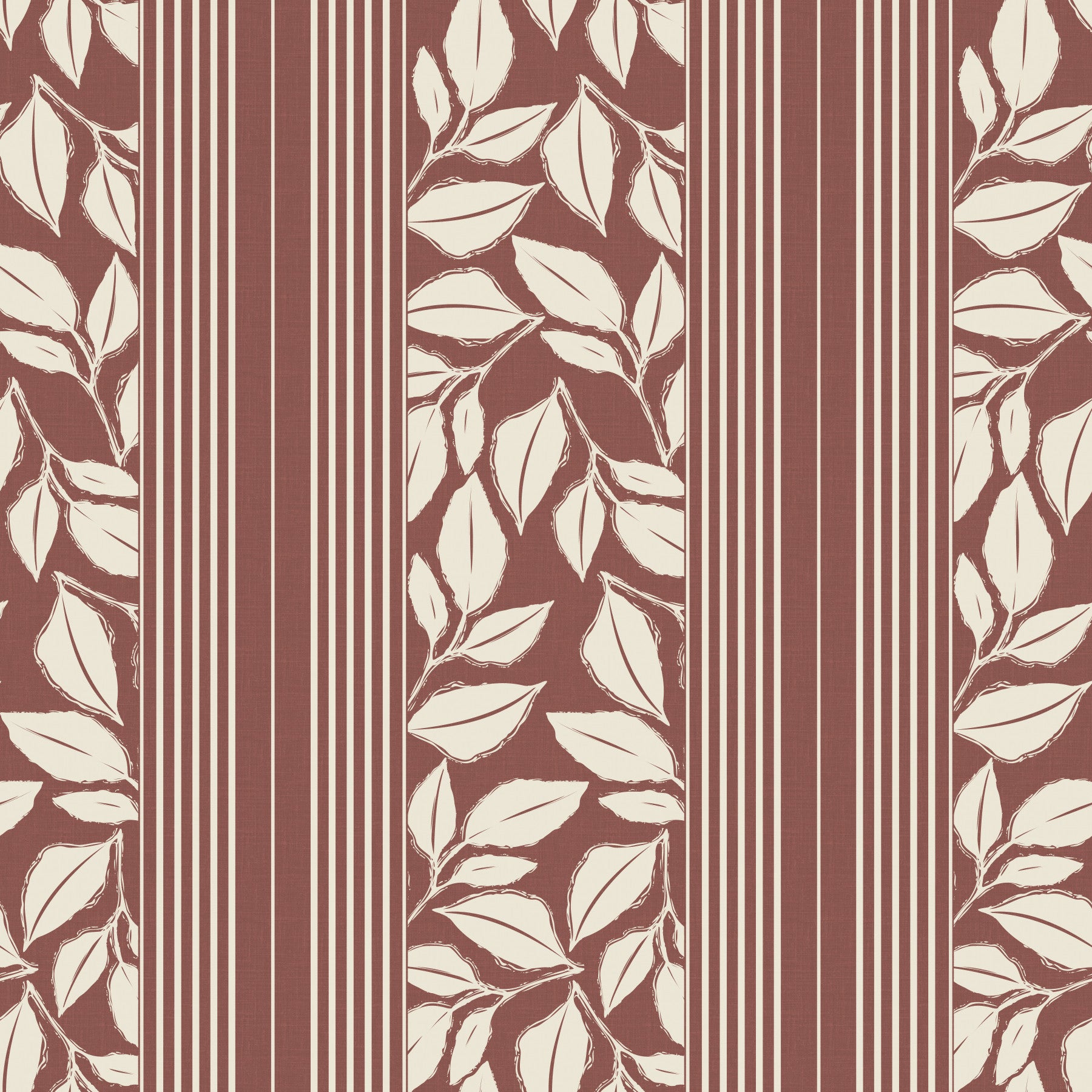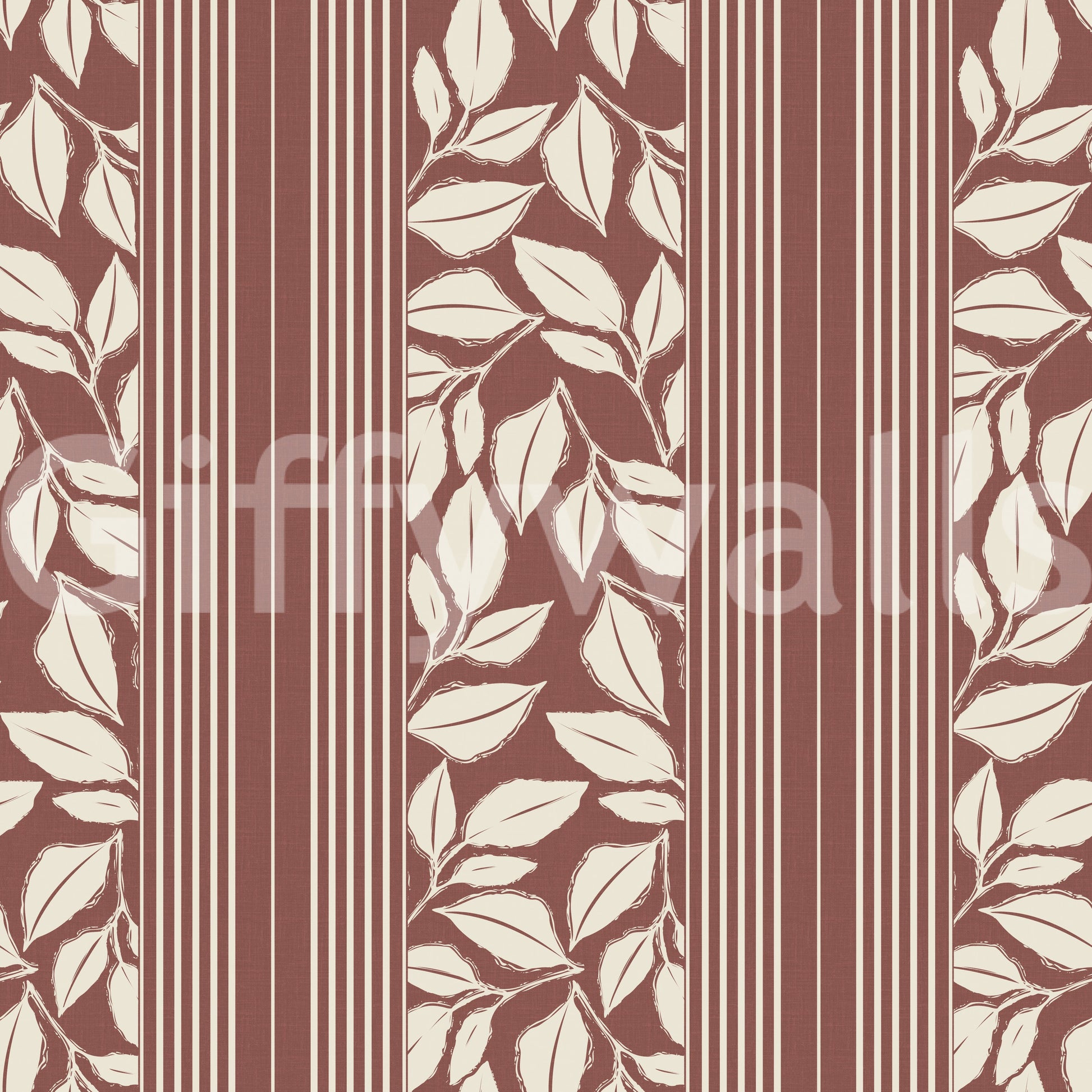 Elevate your space with 'Botanical Stripes', a design that marries the structure of stripes with the fluidity of botanical elements. This wallpaper for walls introduces a soft, inviting mood to hallways, living rooms, or bedrooms. The deep brown ground is contrasted by pale leaf silhouettes, creating a comforting balance. The linear design guides the eye upward, making rooms feel more spacious. These earthy tones complement natural light, enhancing the overall atmosphere of the space. Incorporate it into a home office for a sophisticated backdrop that stimulates calm and concentration.
