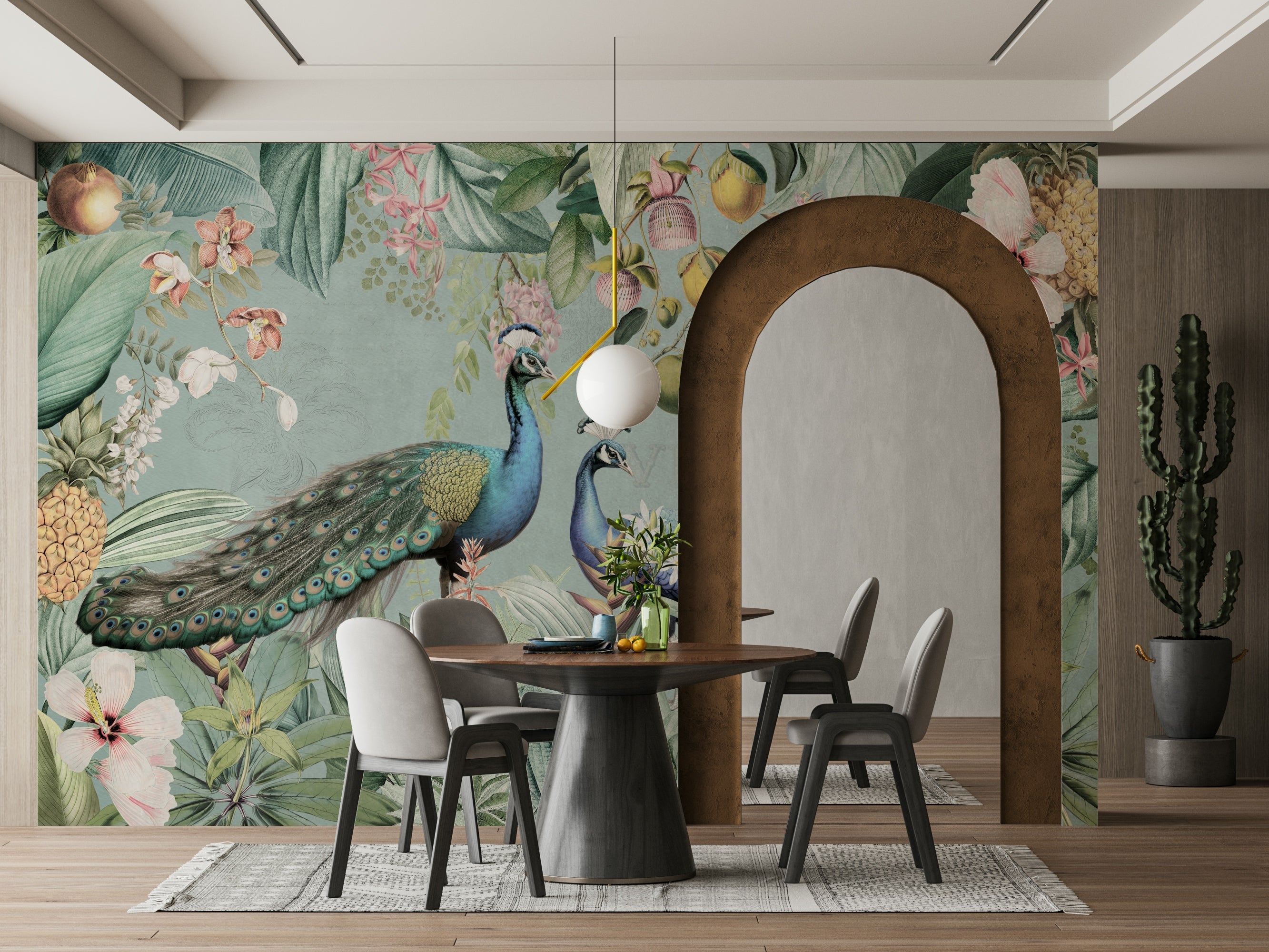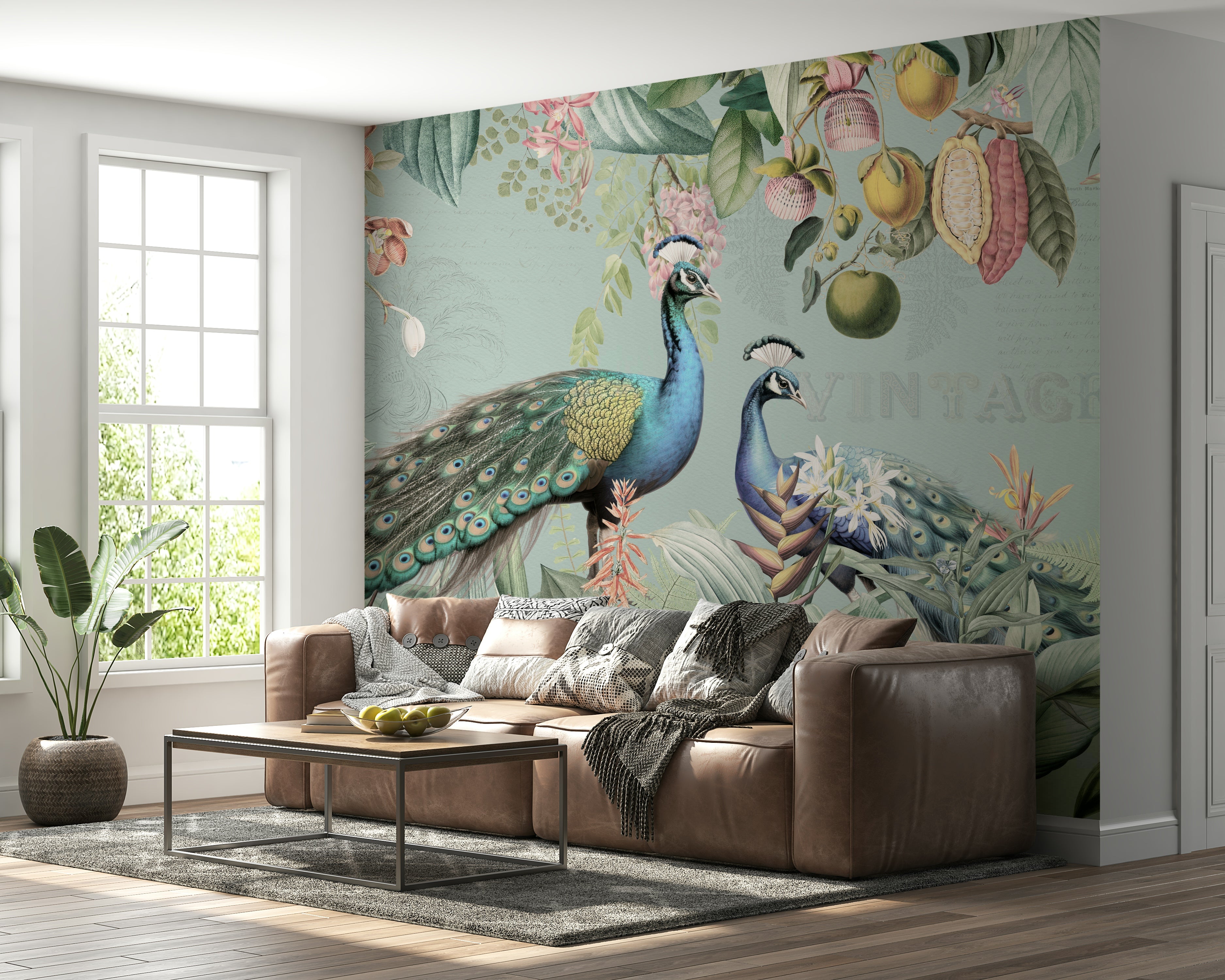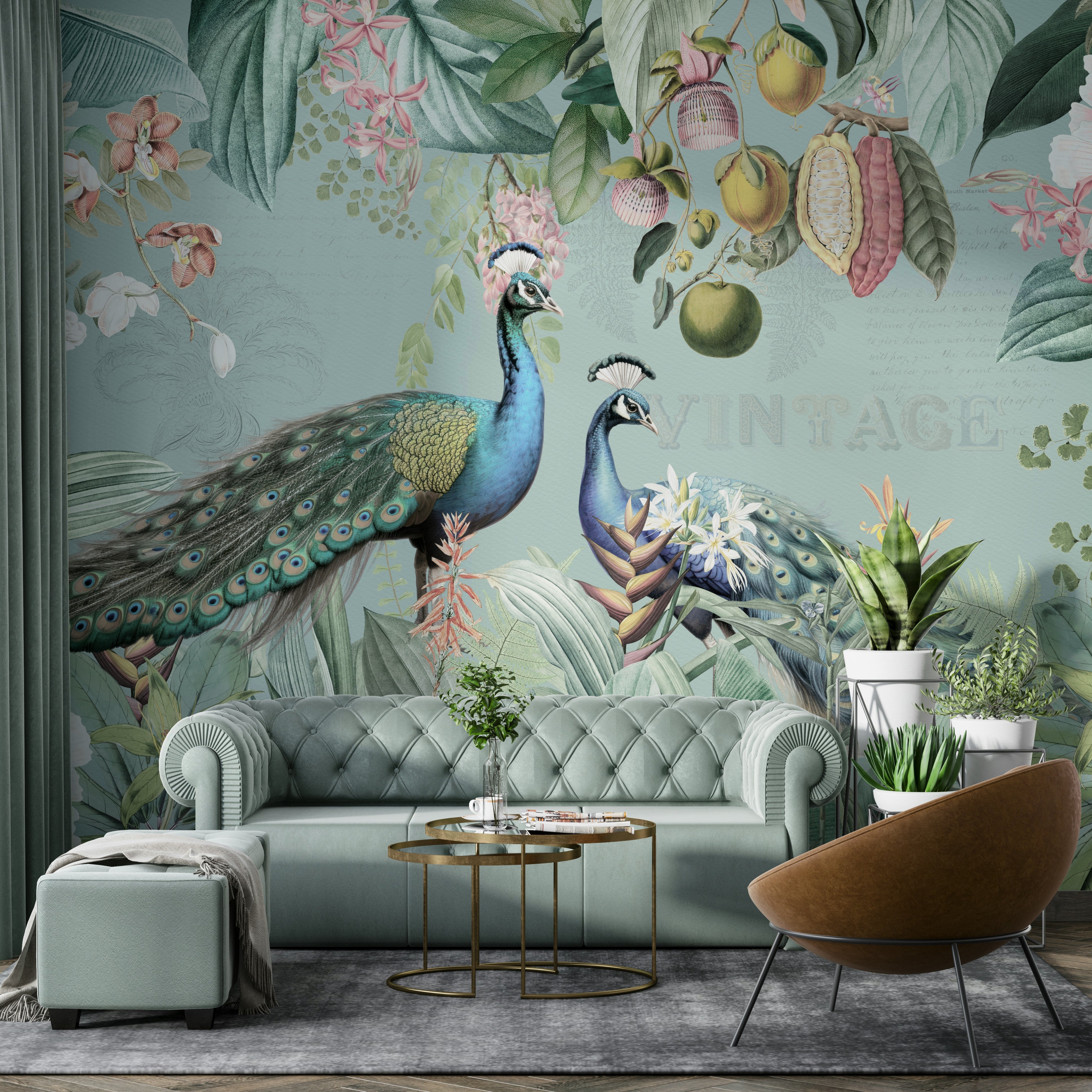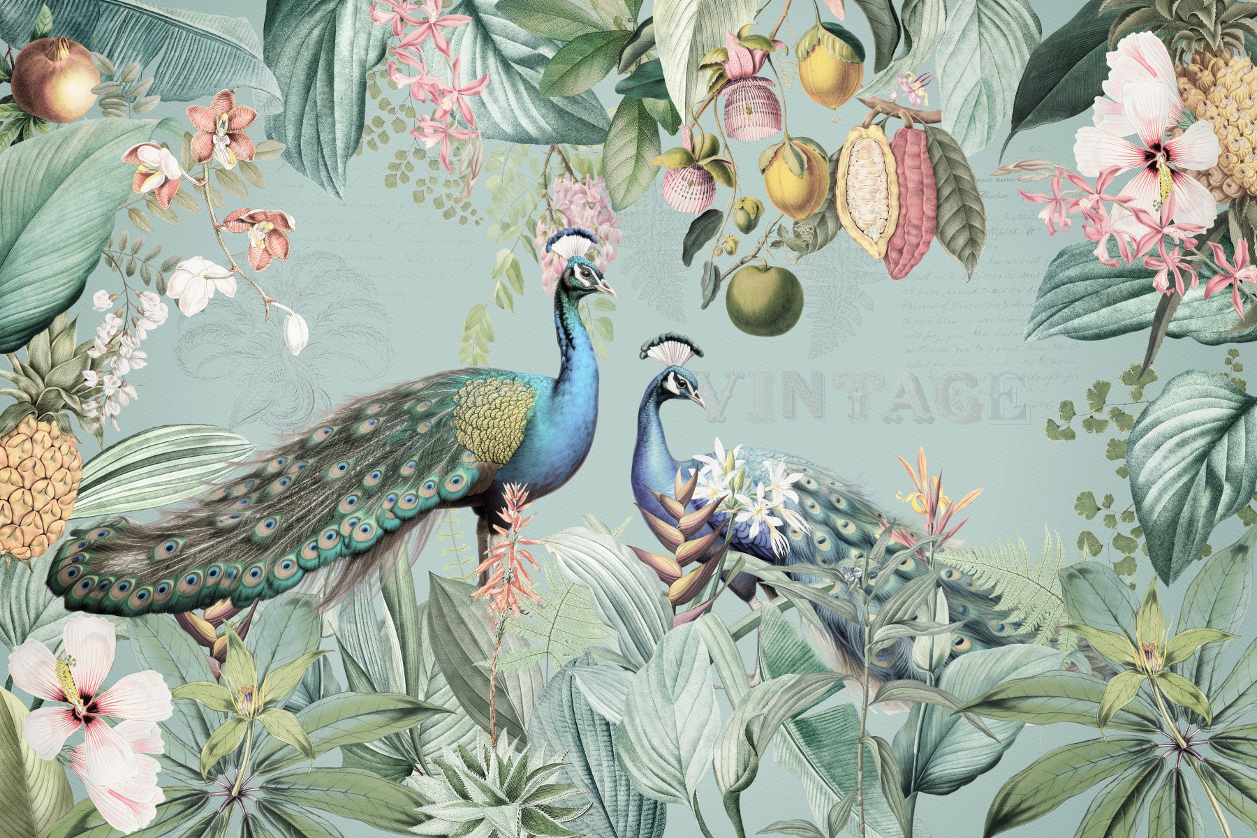This wallpaper transports you to a lush, vintage tropical paradise. Two majestic peacocks, rendered in exquisite detail, stand amidst a vibrant array of exotic plants and fruits. The muted teal background enhances the botanical illustrations, creating a serene and sophisticated atmosphere. The vintage text adds a touch of antique charm, completing the elegant and timeless design. Perfect for adding a touch of exotic beauty to any room, this wallpaper evokes a feeling of calm tranquility and old-world elegance. Its detailed artistry and rich color palette will create a stunning focal point in your home.