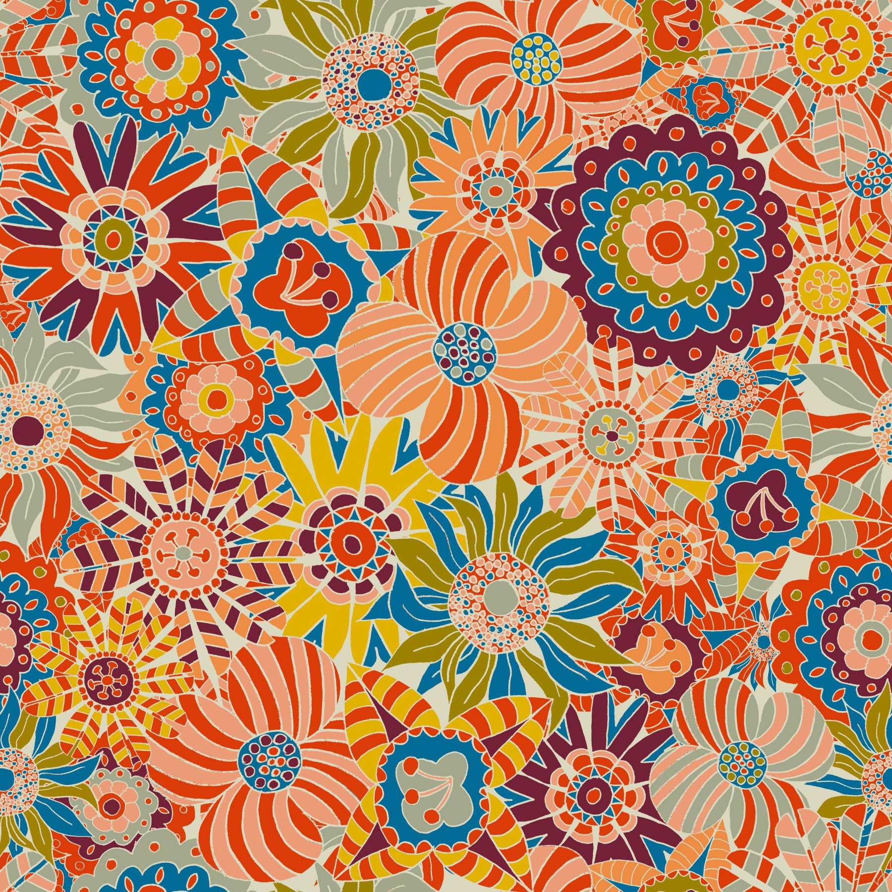 This wallpaper is a Vivid Colors Scandi Round Flowers design, a unique repeating pattern with a soft, artistic style. It's a great wallpaper for walls for a living room, bedroom, or any space that needs a cheerful feel. The design features various hand-drawn flowers in a mix of bright red, blue, orange, and green, set against a light background. Made from high-quality, durable material, this wallpaper is a simple and quick way to refresh your home decor with a one-of-a-kind look.