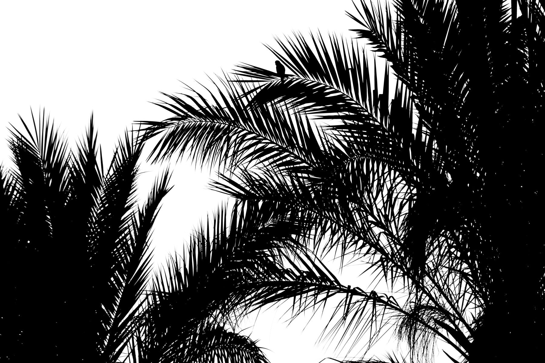 Waiting II captures a moment suspended in time, a starkly beautiful silhouette of palm fronds against a bright, empty sky. The monochrome palette enhances the sense of anticipation, a breath held before the horizon shifts. The intricate details of the palm leaves are rendered in sharp contrast, creating a dynamic yet serene composition. This image evokes a feeling of stillness, a pause to appreciate the natural beauty that often surrounds us. It speaks of tropical breezes and sun-drenched days, hinting at a promise of something just beyond reach. Let this wallpaper infuse your space with a calming presence, a reminder to embrace the quiet moments of waiting, for within them lies potential and reflection. Perfect for those who appreciate minimalist aesthetics and a touch of nature's elegance.