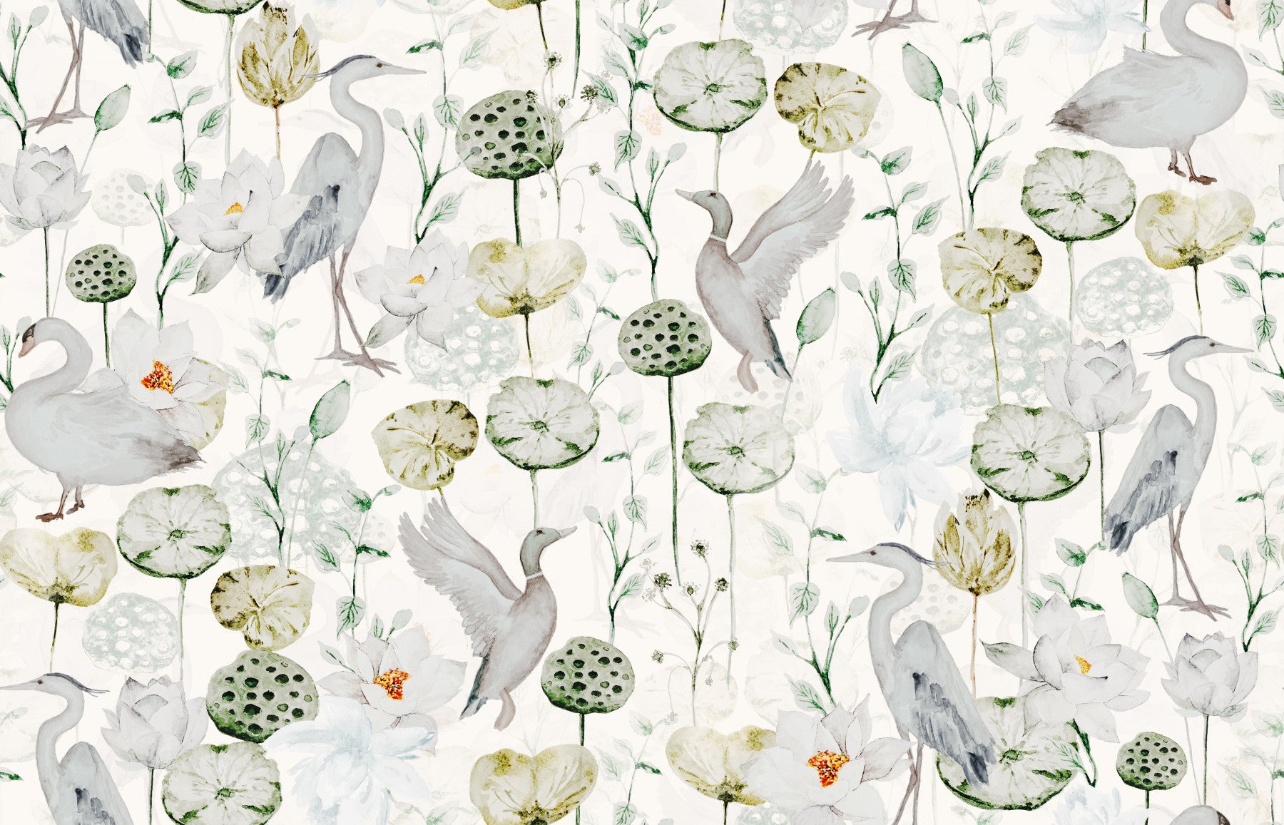 Water Garden Serenity wallpaper mural with pale herons and ducks amongst lotus flowers.