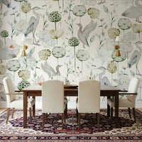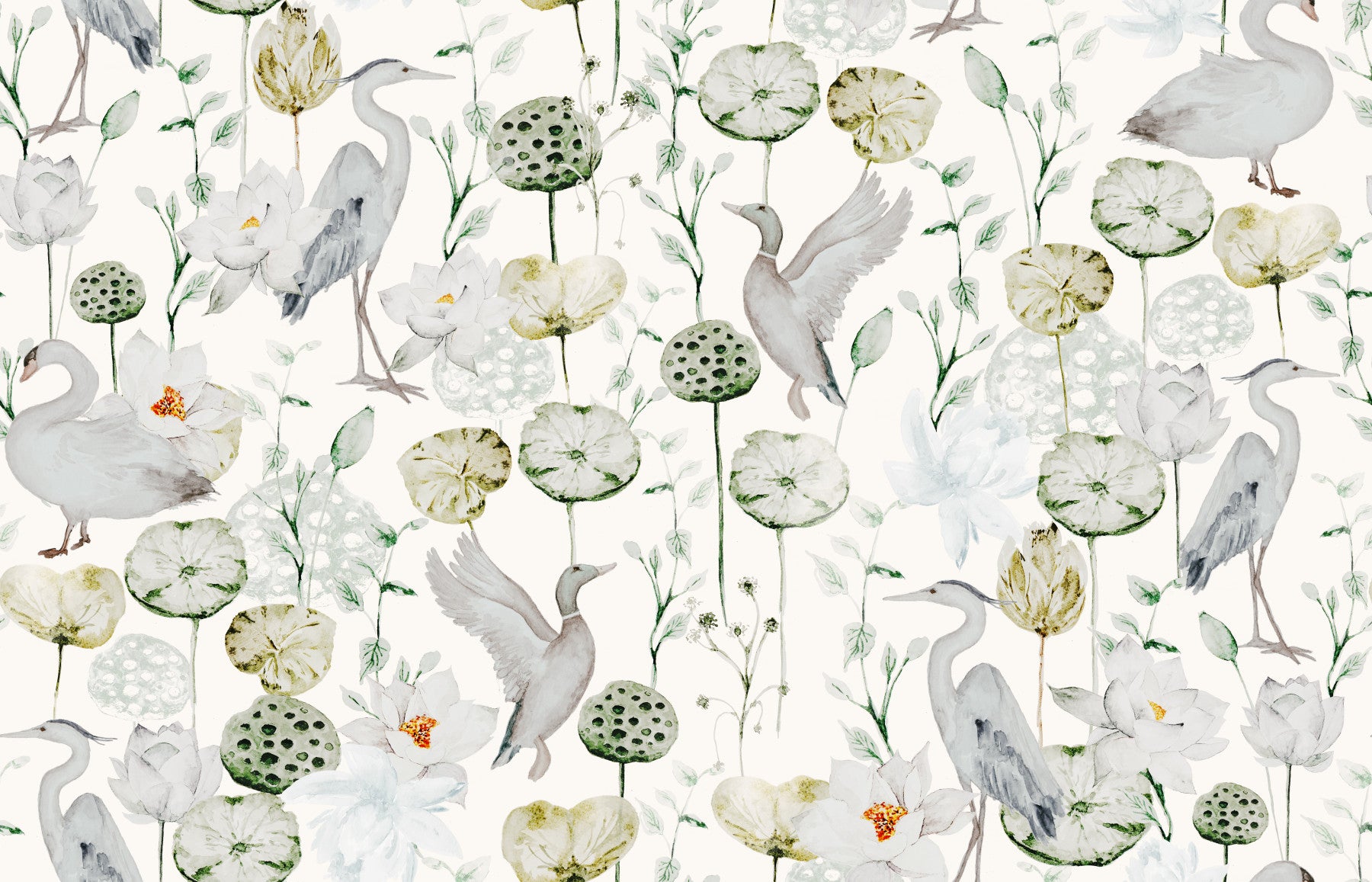 Invite nature indoors with this graceful wallpaper for walls by Uta Naumann! Ducks, herons, and swans in a seamless watercolor pattern alongside ethereal lotus flowers and delicate foliage create a peaceful retreat in your home. The gentle, muted colors promote a tranquil ambiance, perfect for a bedroom or reading nook. This wallpaper complements minimalist and maximalist interiors alike, bringing a breath of fresh air and an artistic touch to your living space.