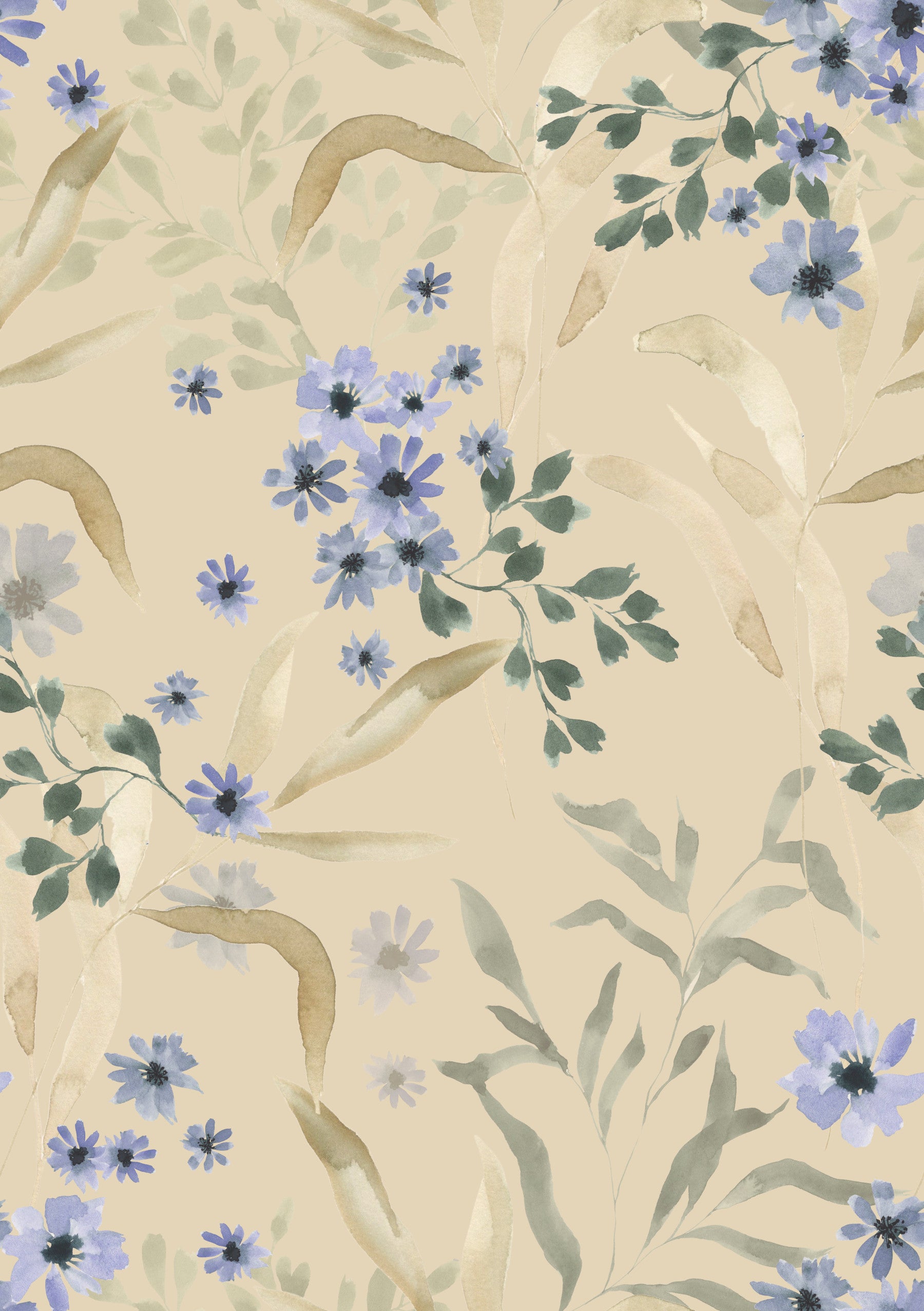 Refresh your interiors with the gentle charm of our Watercolor Bloom wallpaper. This design features delicate blue flowers and soft foliage painted in a beautiful watercolor style. The neutral beige background creates a backdrop that works well with different design styles. This wallpaper for walls adds a peaceful touch to bedrooms, living rooms, or even a nursery. Enhance your space with this calming and stylish botanical design.