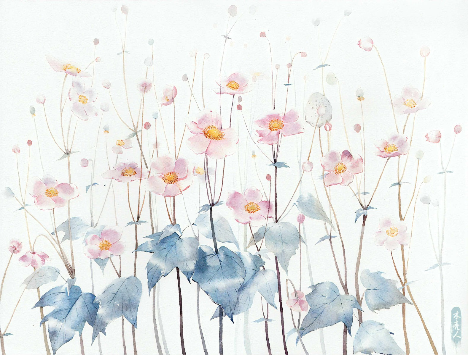 The delicate blue leaves, reminiscent of serene forest canopies, intermingle with the gentle pink petals that seem to drift down like cherry blossoms in spring. The watercolor technique employed gives the wallpaper a fluid, dreamlike quality, ensuring that every glance is met with a calming, painterly vision.