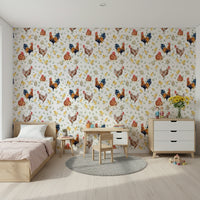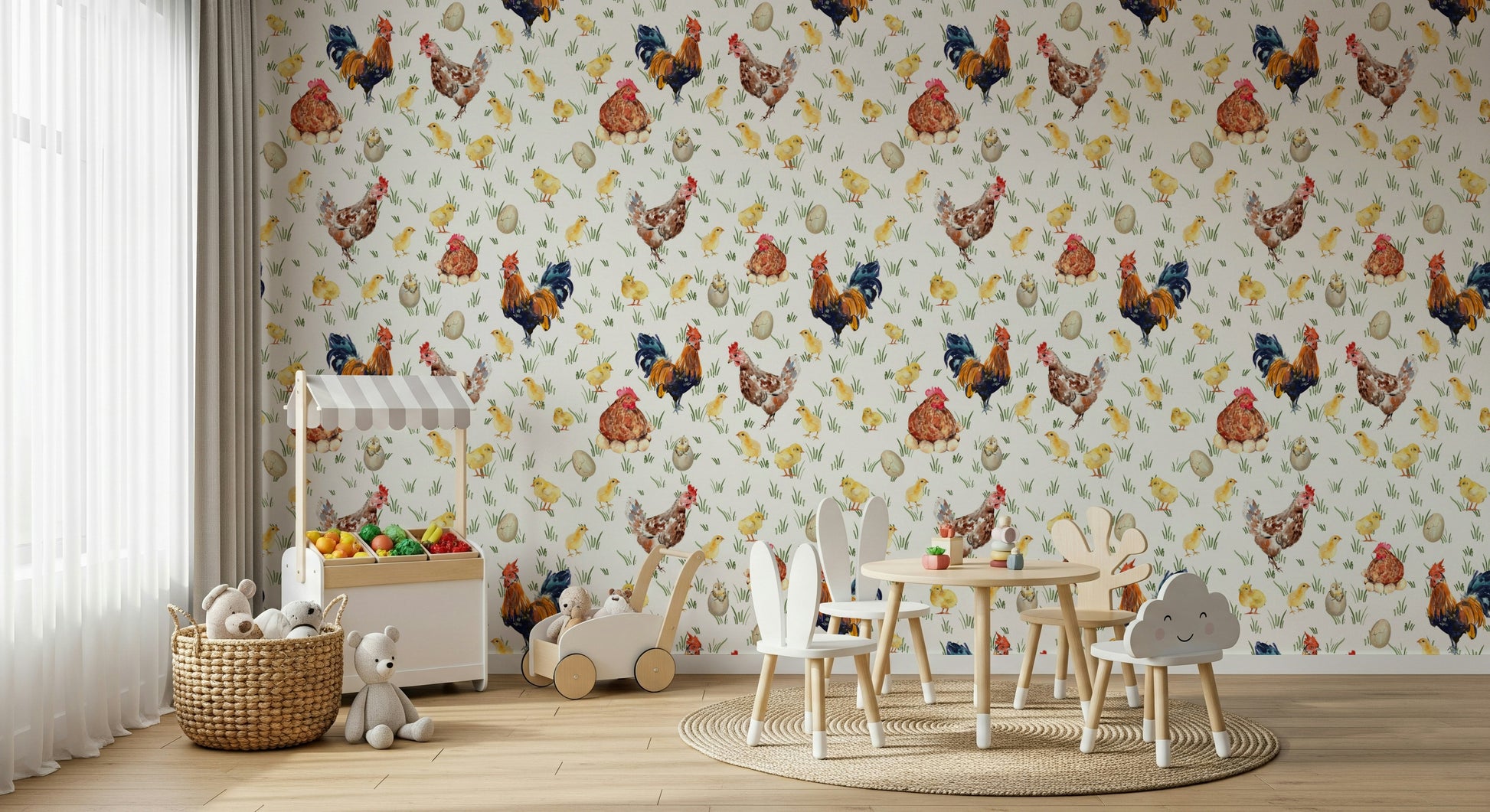 Add a dash of rustic charm with this delightful chicken and chick themed watercolor wallpaper for walls by Uta Naumann. This design showcases playful illustrations of hens, roosters, and fluffy chicks amidst blades of green grass and hatching eggs. The watercolor technique lends a soft, painterly quality, perfect for enlivening a nursery, playroom, or country kitchen. Its inviting design complements interiors inspired by farmhouse living, adding an atmosphere of warmth and joyful simplicity.