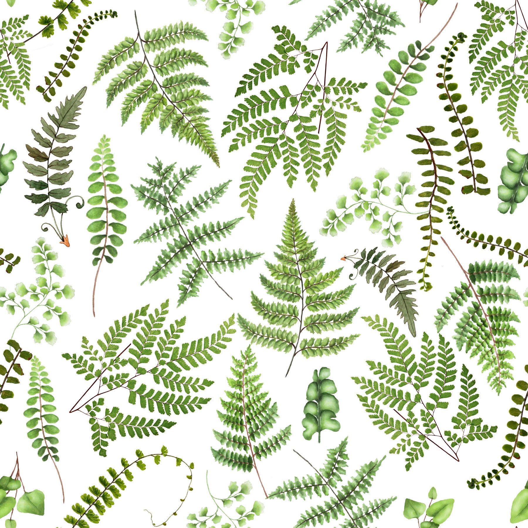 This wallpaper features a delicate arrangement by Uta Naumann of watercolor ferns against a clean backdrop. The artwork employs shades of green to bring a sense of calm and organic appeal to interiors. Use this wallpaper for walls to create a serene bedroom, a soothing living room, or a refreshing bathroom. It will pair well with light wood, natural textures, and earthy color palettes. It creates a relaxing mood, making it perfect for spaces where you want to relax and unwind.