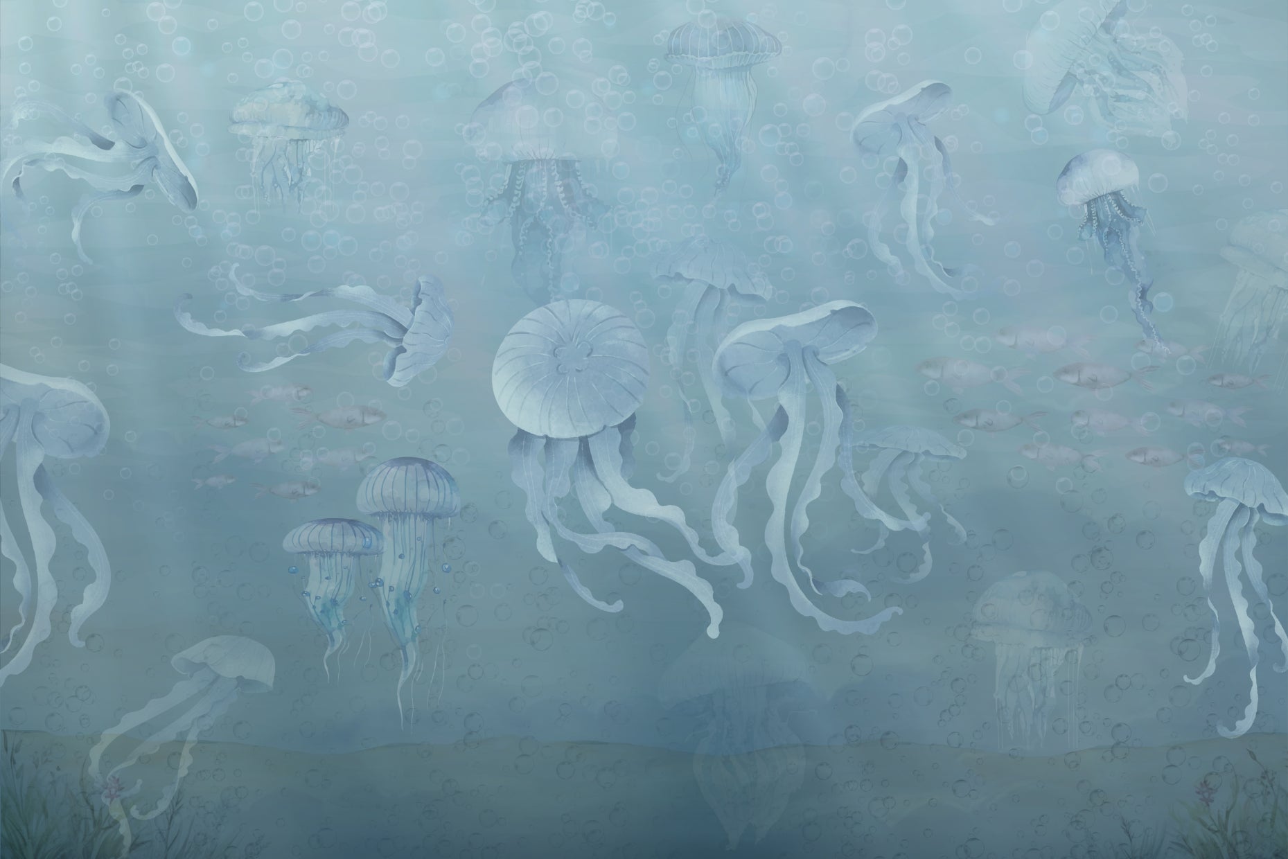 Dive into serene ocean vibes with the Watercolor Jellyfish Ocean Wallpaper. This enchanting underwater wallpaper features graceful jellyfish drifting through soft, blue waters, surrounded by delicate bubbles and subtle schools of fish. The watercolor design adds an artistic, calming touch, perfect for bedrooms, bathrooms, or living areas seeking a coastal aesthetic. Its soothing hues and fluid motion bring a peaceful, ocean-inspired feel to any space. Ideal for creating a tranquil retreat, this underwater wallpaper blends nature and art beautifully, making it a standout choice for those who love the sea's quiet elegance.