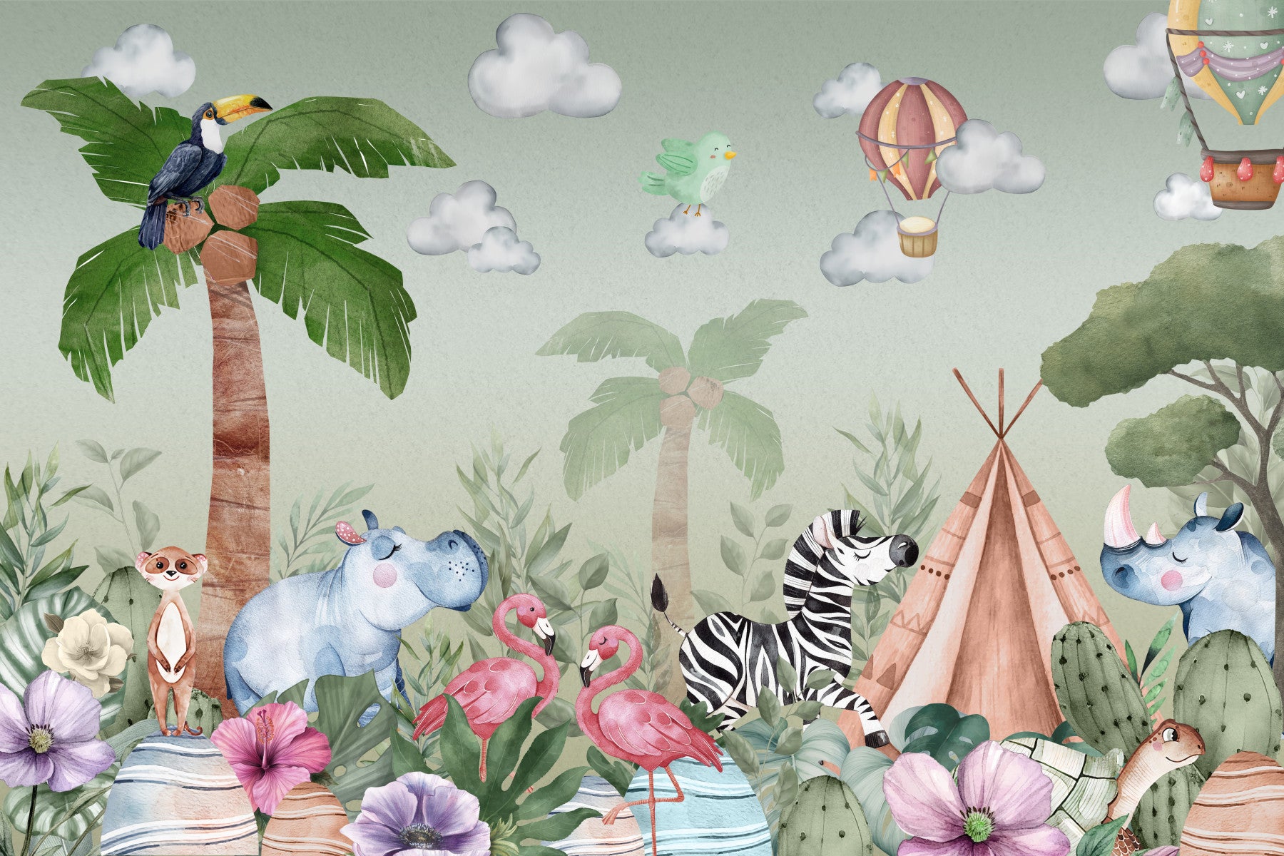 Transform any room into a dreamy jungle with this beautiful watercolor design. Featuring flamingos, zebras, hippos, and other delightful wildlife under a soft green sky, this wallpaper brims with charm. It's an excellent choice for a children’s room, playroom, or even a cozy reading nook. This wallpaper for walls uses light colors and whimsical details to bring a playful, friendly atmosphere to any space. The design effortlessly enhances interiors with its blend of artistic style and inviting theme.