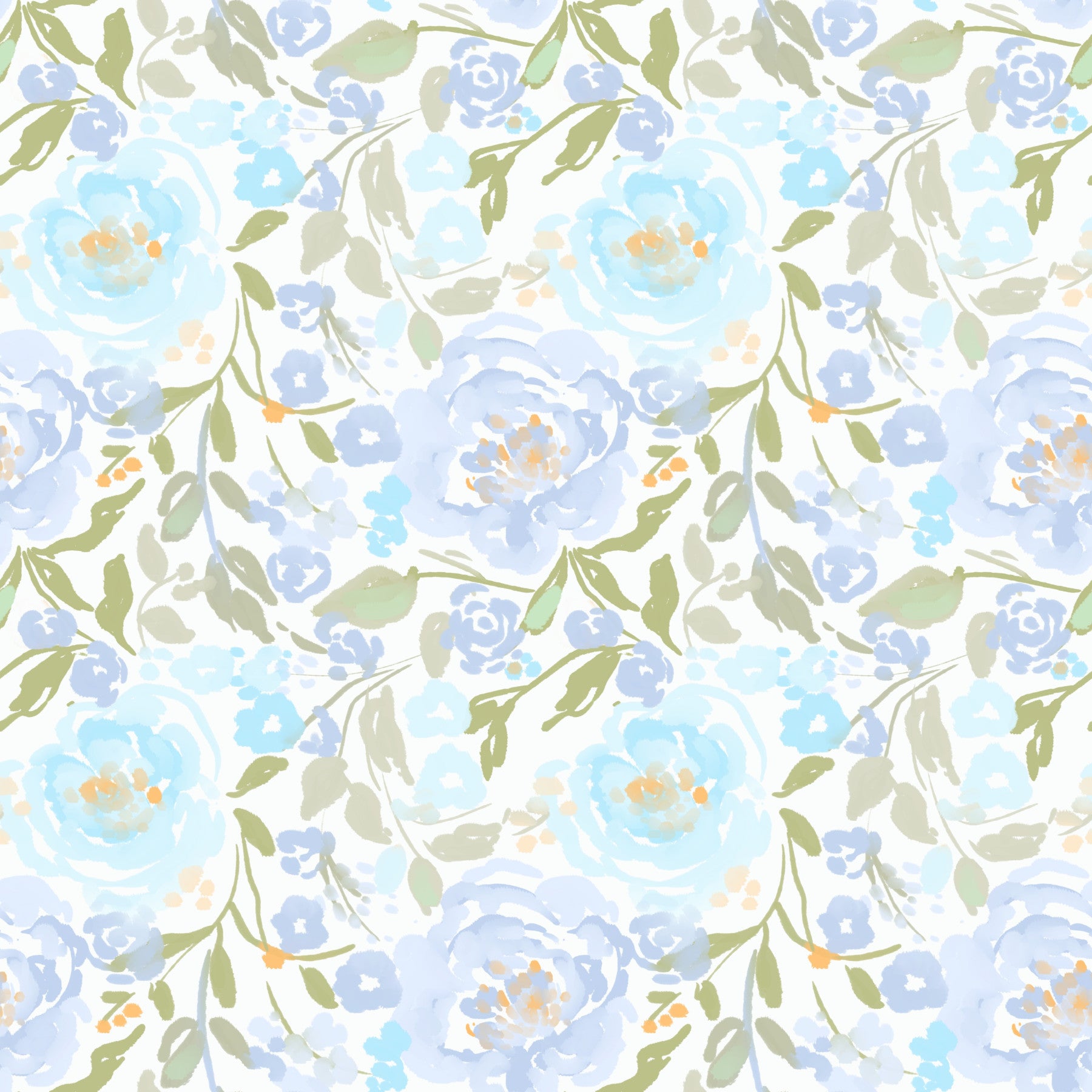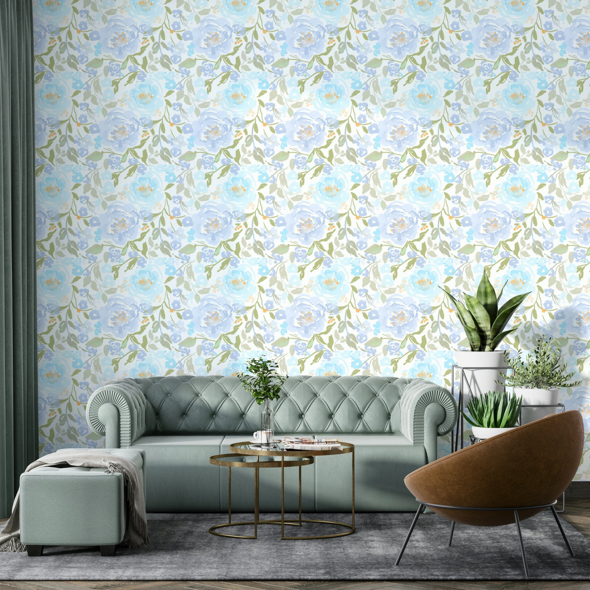 Decorate your home with a calming floral pattern that echoes watercolor painting. This design offers soft blue blooms with green and beige foliage on a white background. The artistic, brushstroke finish adds depth. Use this wallpaper for walls to introduce a serene, sophisticated atmosphere to bedrooms, living rooms, or bathrooms. The blend of pastel colors is adaptable, complementing both light and darker furniture sets. Enjoy how this pattern breathes life into any room, turning it into a peaceful, floral refuge.