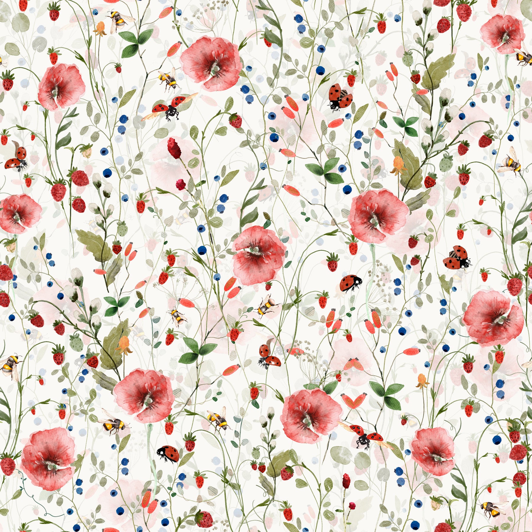 Bring a touch of the outdoors inside with this cheerful watercolor meadow scene by Uta Naumann. It features a delicate pattern of red poppies, strawberries, blueberries, and tiny insects. The soft watercolor style creates a light and airy feel. This wallpaper for walls suits a variety of spaces, from a cozy bedroom to a cheerful living room. It also makes a lovely addition to a nursery or playroom. The design blends easily with minimalist furniture or adds a whimsical touch to bohemian interiors. The gentle color palette ensures it enhances rather than overwhelms your space.