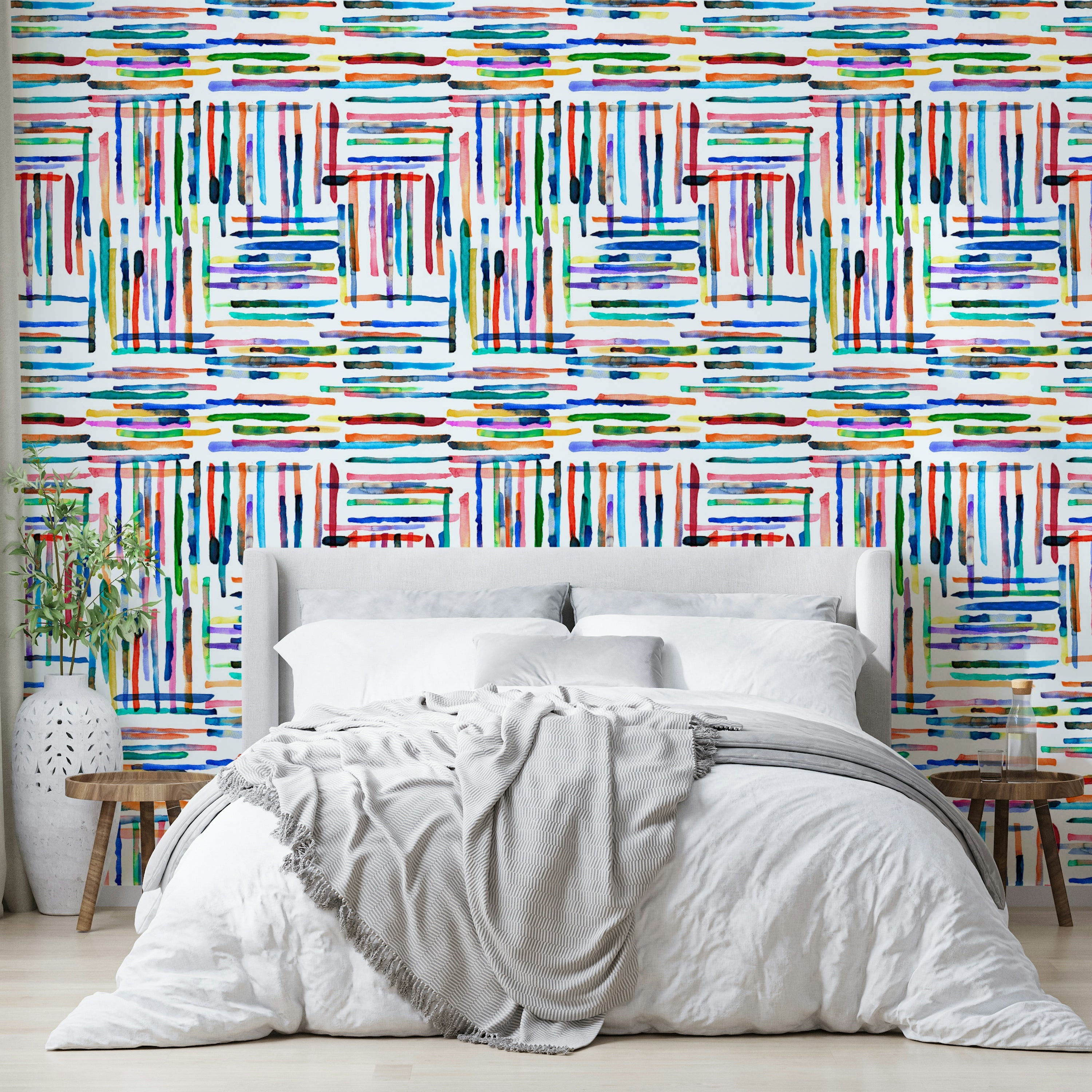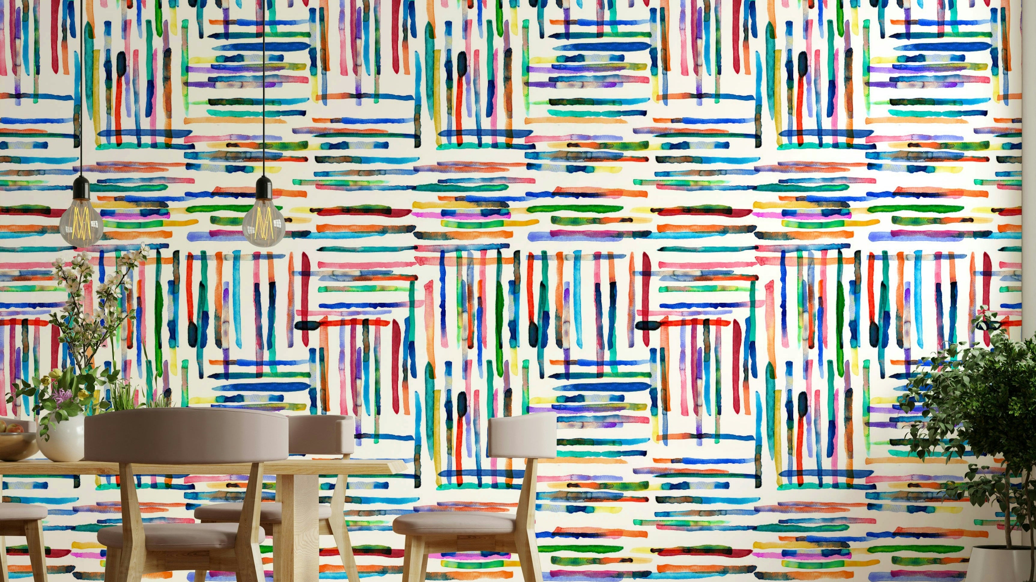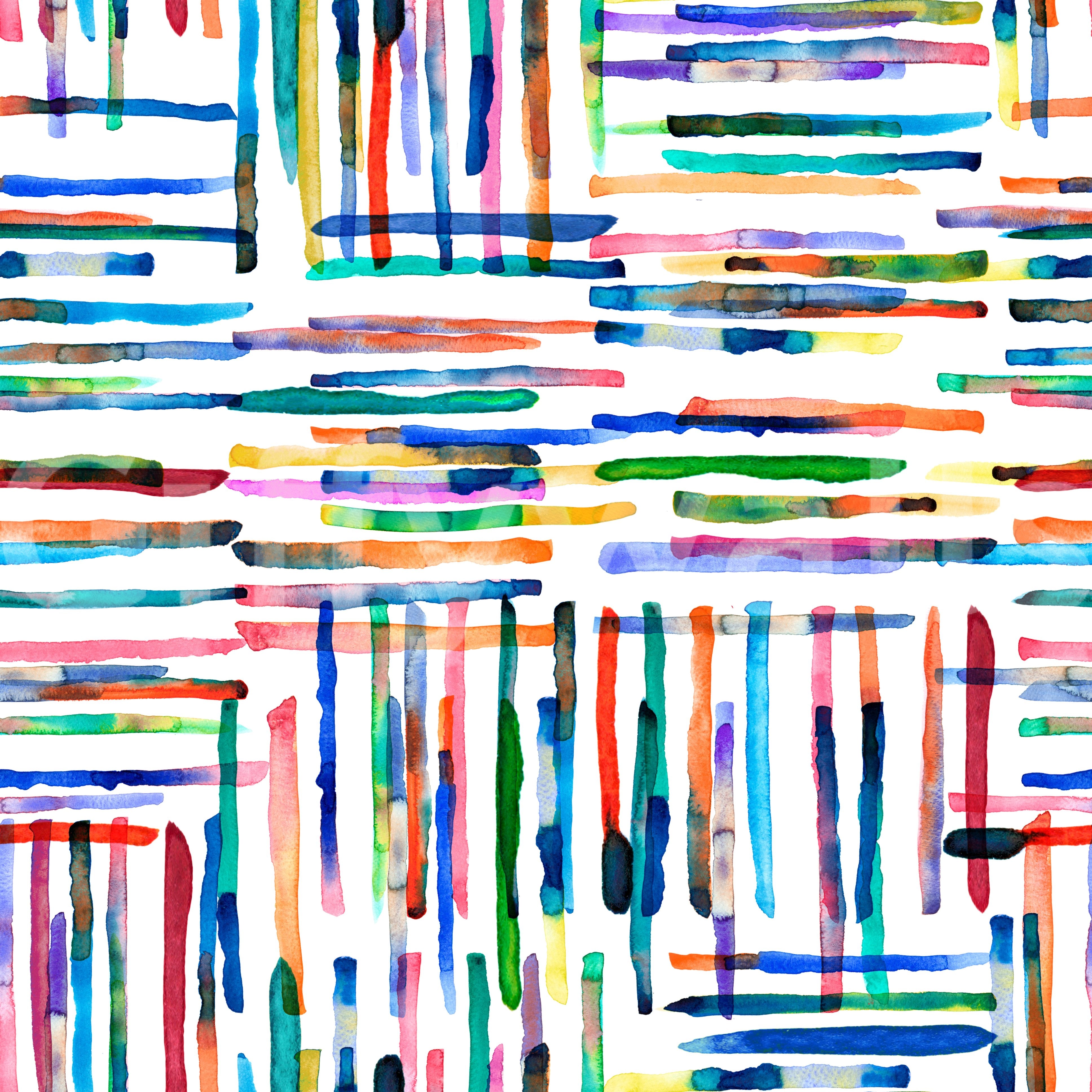 Dive into a vibrant world of color with this "Watercolor Stripes Tile Blue" wallpaper. A captivating design featuring intersecting stripes of hand-painted watercolor washes, this wallpaper bursts with energy and playful hues. The bright, joyful palette, ranging from deep blues and greens to fiery oranges and reds, creates a dynamic and uplifting atmosphere. The slightly irregular edges of each watercolor stroke add a touch of organic texture and artistic charm, contrasting beautifully with the structured grid pattern. Perfect for adding a modern, artistic touch to any digital device, this wallpaper will breathe life and color into your screen.