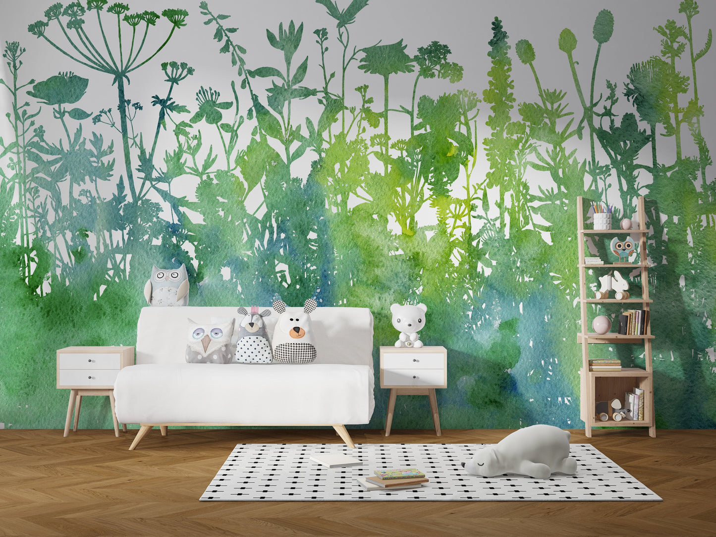 This watercolor grass tree botanical design wallpaper mural illustrates the tranquility of nature, which brings the essence of nature to your home. The design comprises a luxuriously green palette, miming the vitality of grass and the elegance of tree shape in watercolor style. Ideal as a base for building many different interior decoration schemes, this green wall covering has a focalized wall of the room for its backdrop. This grass wallpaper with a refined botanical pattern makes the environment calming. It is suitable for bedrooms, lounges, and offices where a wish is to combine an airy feel of natural elegance. [A] This wallpaper is a small window to the natural world it provides daily.