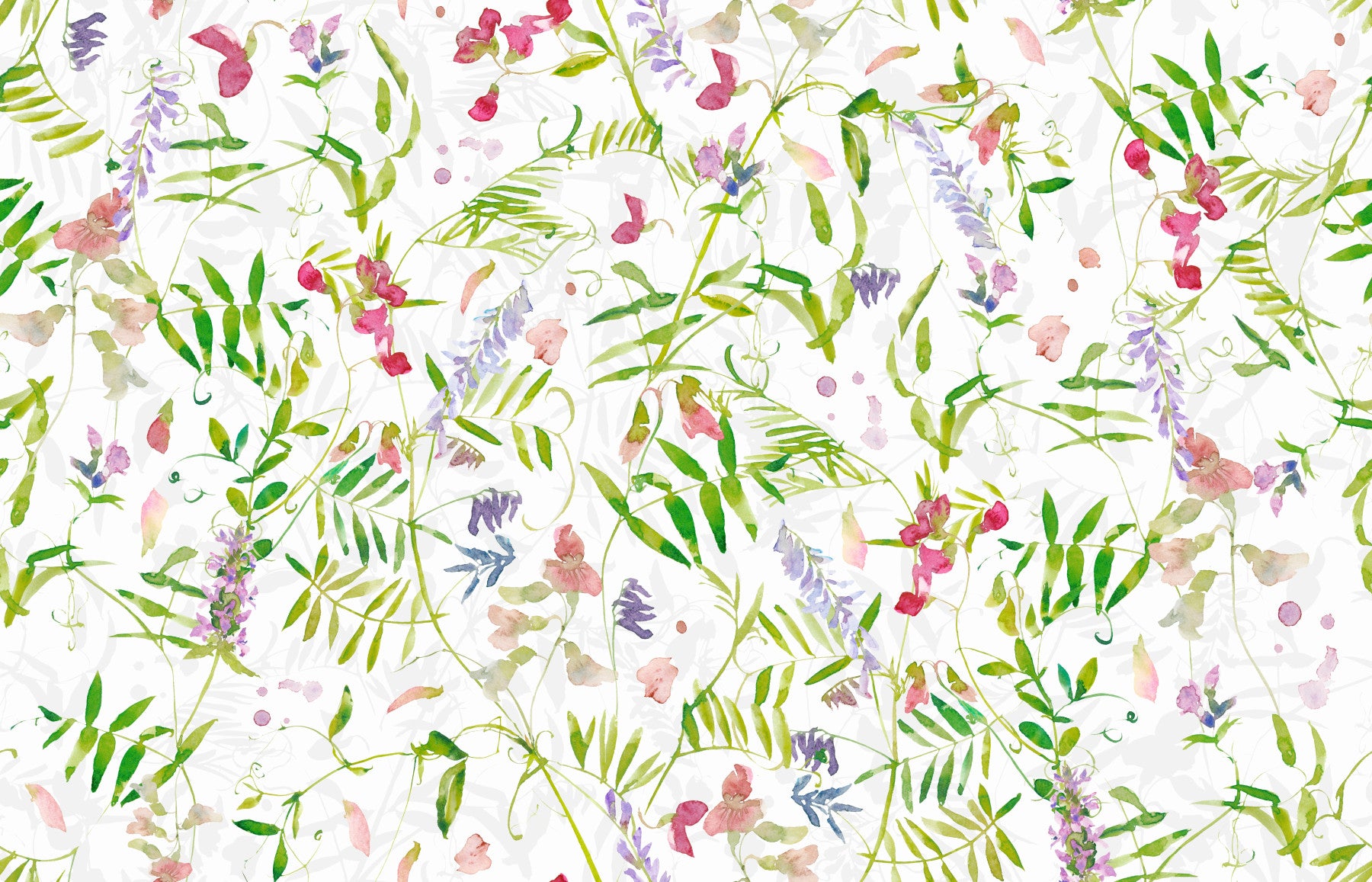 Embrace a gentle botanical vibe with this delicate watercolor floral wallpaper for walls by Uta Naumann. The design features a harmonious blend of soft pinks, purples, and greens on a bright backdrop. This delightful wallpaper brings the serenity of a wildflower meadow into your living space. Ideal for bedrooms, nurseries, or any room where you want to create a calm and airy ambiance, it also complements rooms with natural light and minimalist décor. Its light, pastel shades pair very well with white furniture or a more colorful room, creating a charming, welcoming atmosphere.