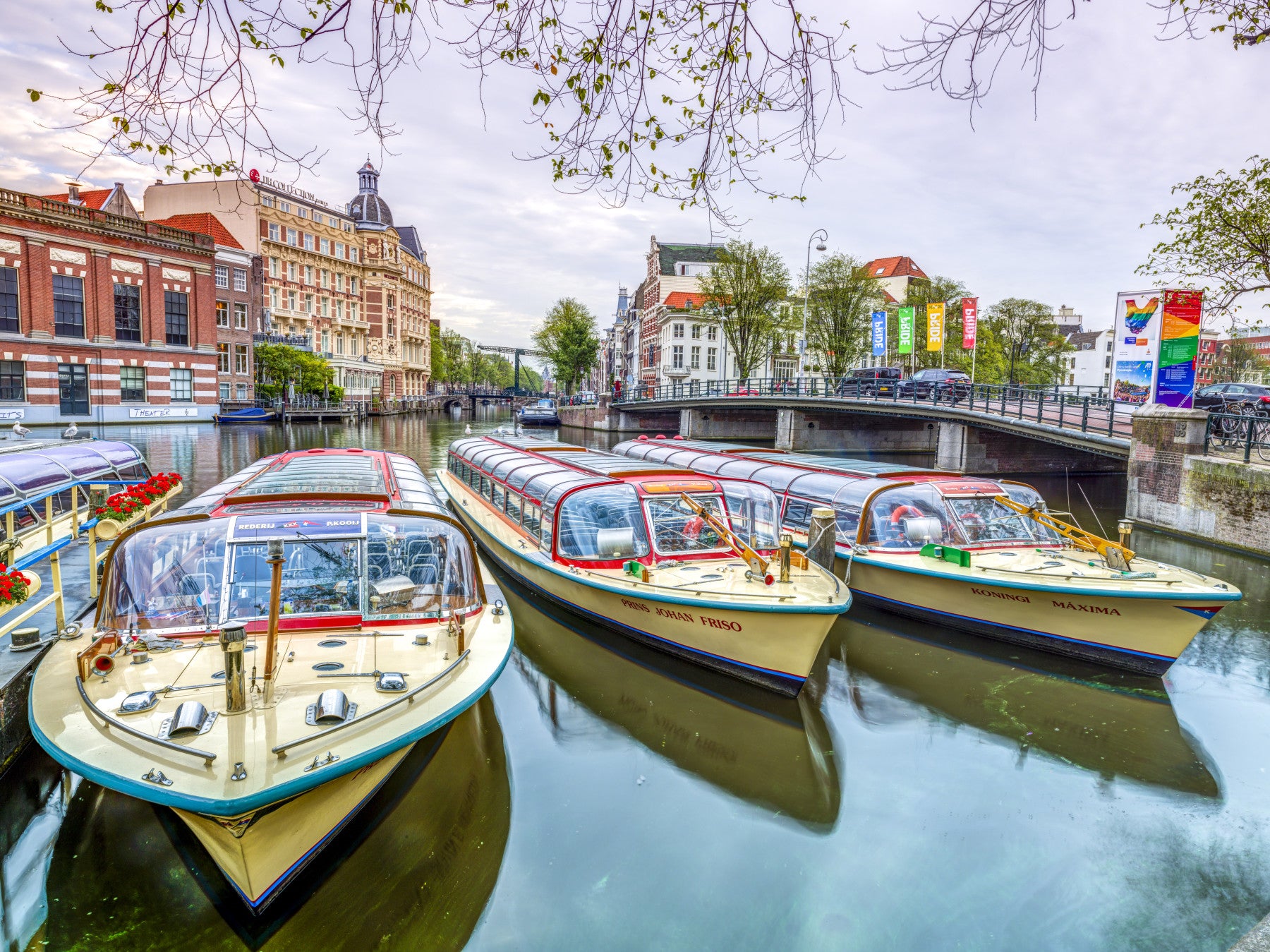 The canal houses are tall and have classic Dutch architecture.