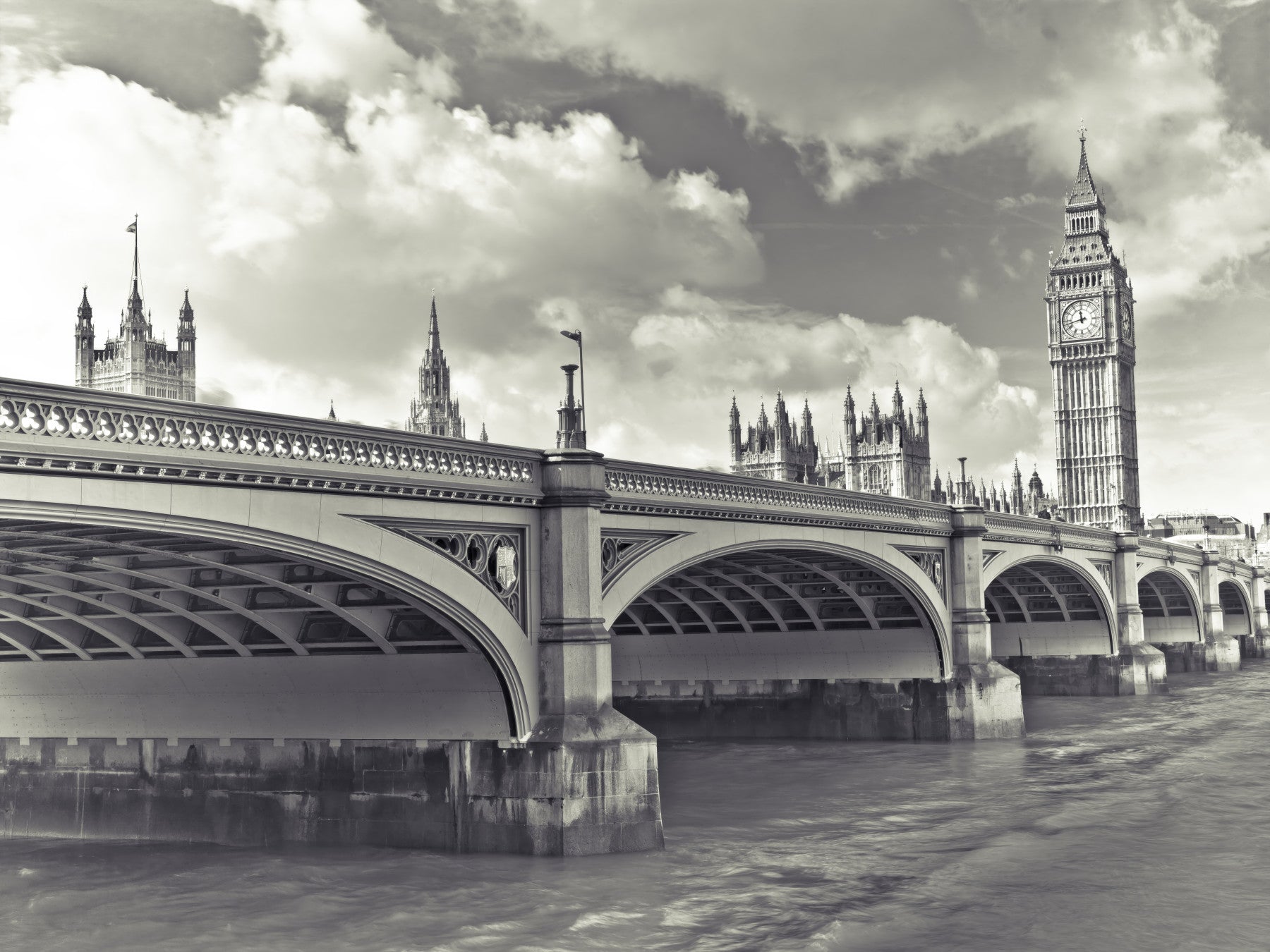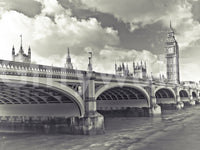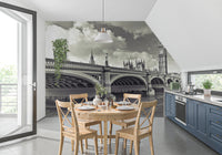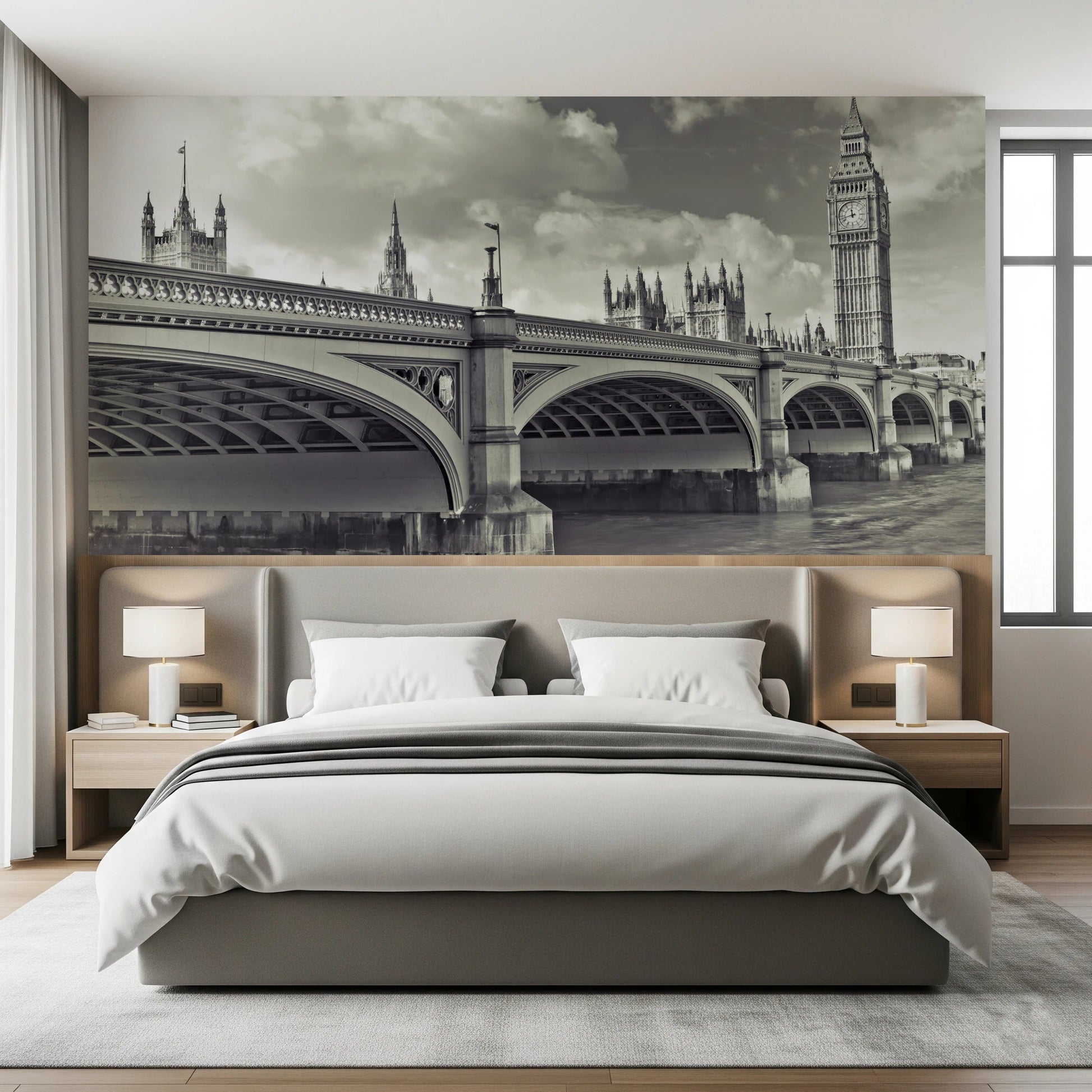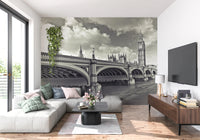 Infuse your living space with this stunning urban wallpaper for walls. The black and white photograph highlights London's historic Westminster, showcasing the Houses of Parliament and the Elizabeth Tower (Big Ben) against a dynamic sky. This image delivers a sophisticated, architectural design to any room. Its neutral palette works well in hallways, studies, or dining rooms, and the composition adds depth and a sense of scale. Bring the atmosphere of a world-renowned city into your home, creating a space that is both elegant and timeless.