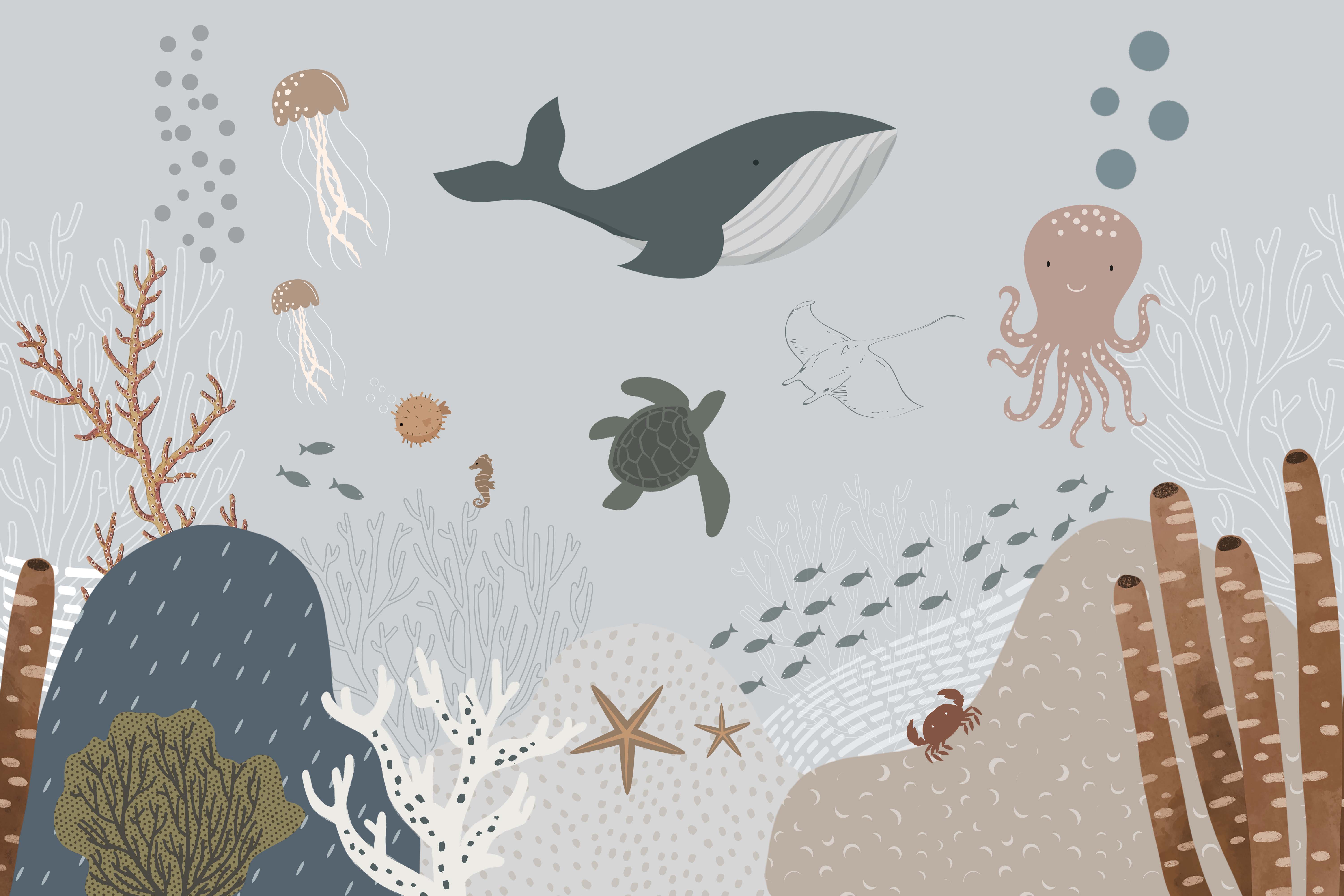 Transport the beach to your child's room with the hypnotizing aquamarine underwater scene children's room wallpaper. This marine-themed wallpaper is just right to bring the bedroom decor to life with colorful sea creatures and Flora. Your child will dream of a fantastical underwater landscape while drifting off to sleep. This fantastic mural paper will widen their sense of wonder and provide unlimited options to explore adventure and acquire knowledge and play. Award your child the present of an experiential and relaxing room environment; they will never forget it!