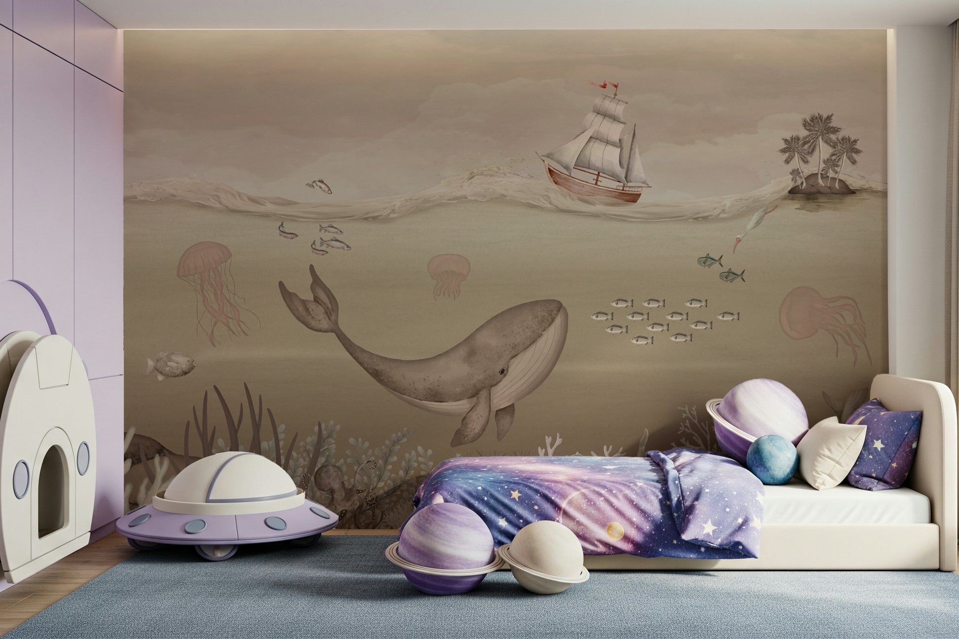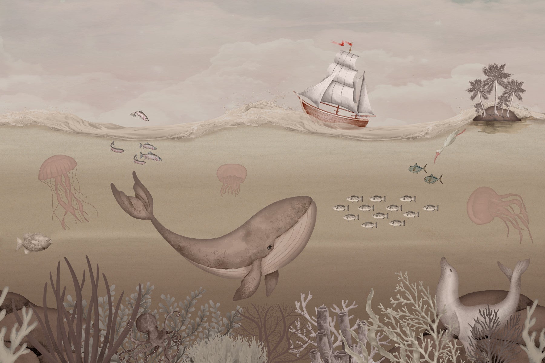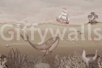 Embark on a captivating journey with this underwater scene! A majestic whale glides through serene waters alongside colorful sea creatures and a classic sailboat. The gentle tones create a tranquil mood perfect for bedrooms, nurseries, or bathrooms. This wallpaper for walls brings a touch of nautical charm to interiors while providing a calming backdrop. Soft, muted color palette is soothing to the eye.