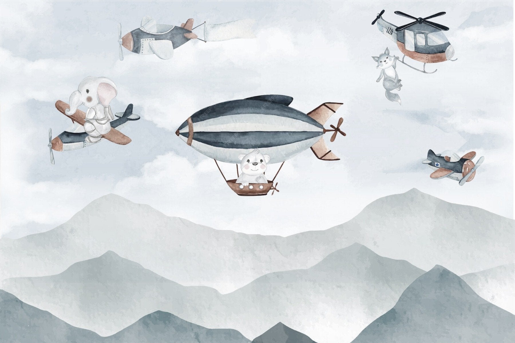 Elevate a child's playroom into a dreamscape with the whimsical airborne adventure mural. This enchanting wallpaper features a squadron of delightful animals piloting planes, helicopters, and airships above serene mountain landscapes. Perfect for sparking imagination in young minds, this mural turns every wall into a storybook scene of adventure and discovery. The gentle hues and soft textures blend seamlessly with the playful theme, making it a delightful mountain wallpaper choice for a touch of whimsy in a nursery or play area. Let the whimsical airborne adventure mural whisk away the mundane and fill the room with the joy of flight and fantasy.