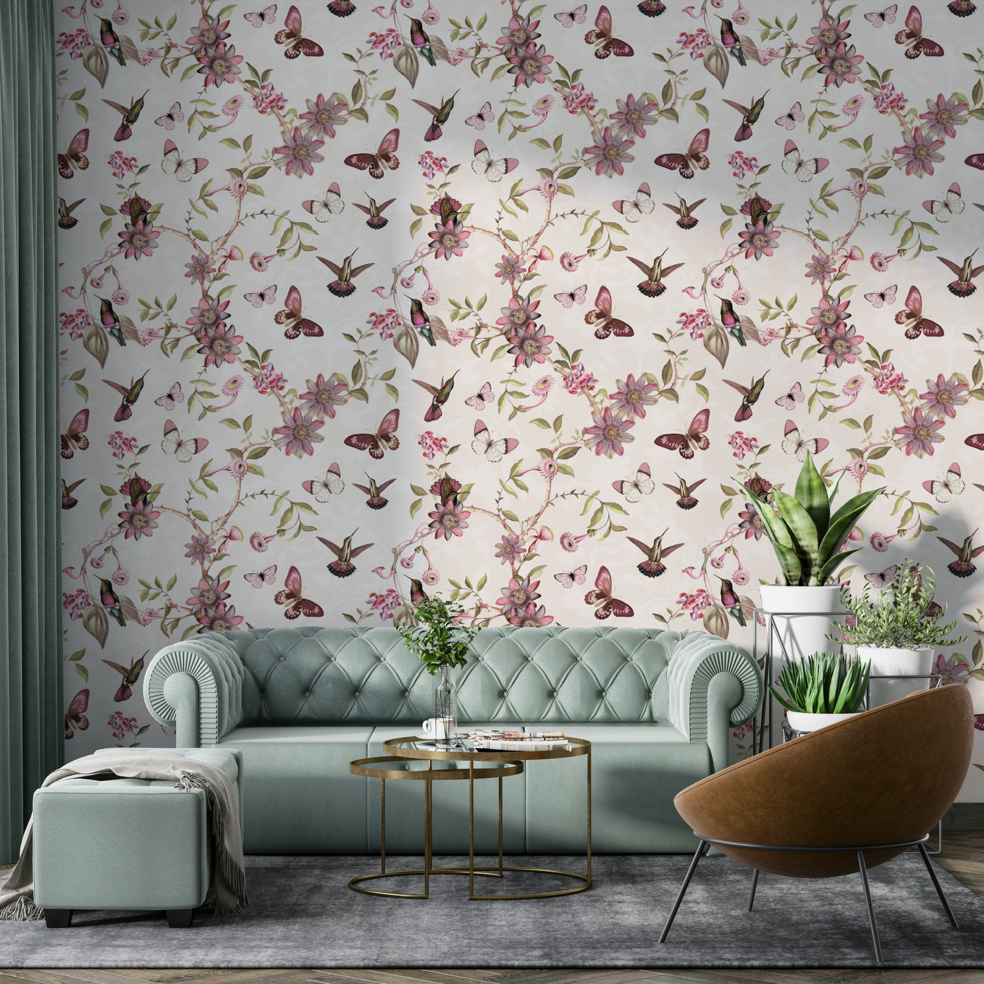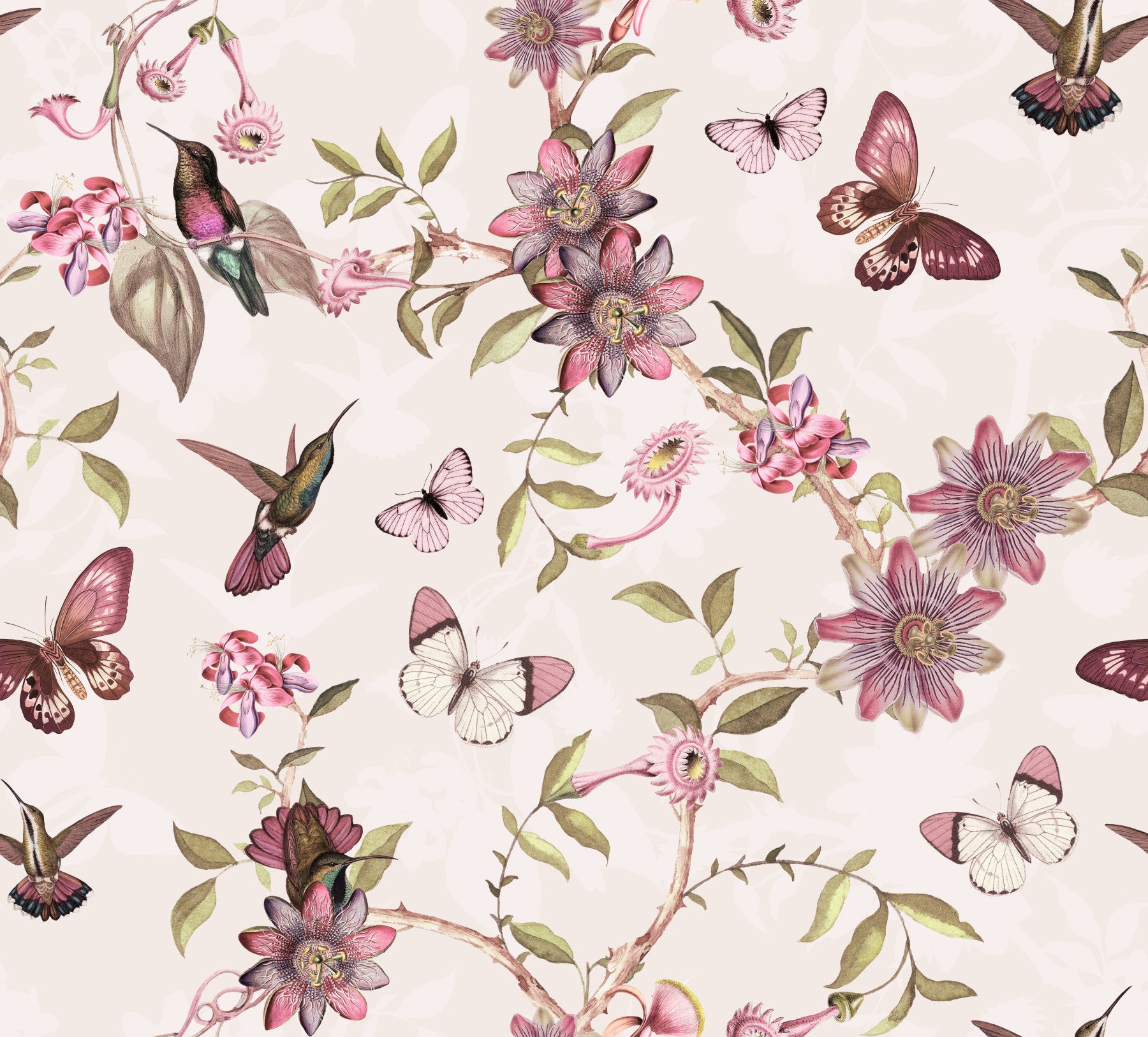 This wallpaper transports you to a serene botanical garden teeming with life. Delicate pink and purple passion flowers intertwine with lush green foliage, creating a tranquil backdrop. Graceful hummingbirds hover amidst the blooms, their iridescent feathers catching the light, while vibrant butterflies flit playfully around. The vintage-inspired illustration style adds a touch of classic elegance, making this wallpaper a perfect choice for creating a calm and sophisticated atmosphere in any room.