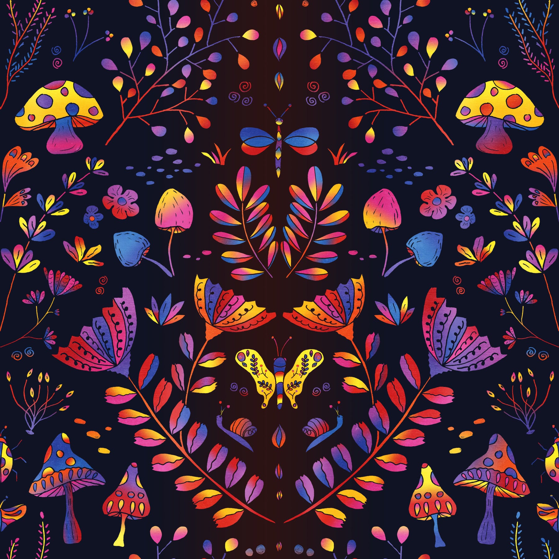 Step into a vibrant, dreamlike garden where fantastical flora and fauna intertwine. This wallpaper bursts with color, showcasing a kaleidoscope of iridescent mushrooms, whimsical flowers, and playful insects like butterflies and dragonflies. The design boasts a symmetrical arrangement, creating a captivating and mesmerizing effect against a deep navy background. Delicate leaves and swirling patterns add to the overall enchanted atmosphere, making this a truly unique and captivating piece for those seeking a touch of magic in their digital world. The radiant hues and intricate details evoke a sense of playful wonder, perfect for adding a whimsical touch to any screen.